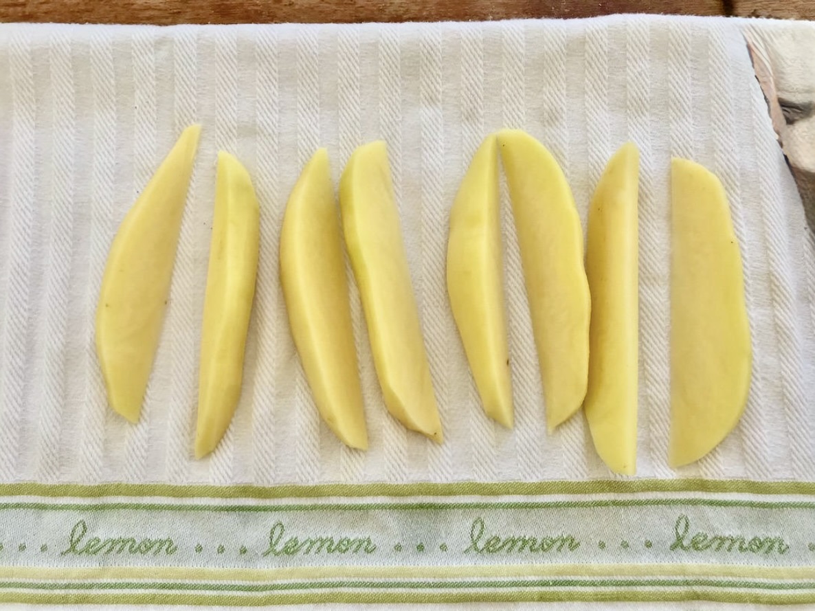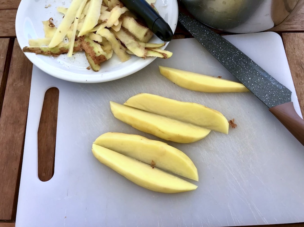 Ziemniaki: 3 duże, podłużne ziemniaki sałatkowe (typ, który nie rozpada się podczas smażenia).