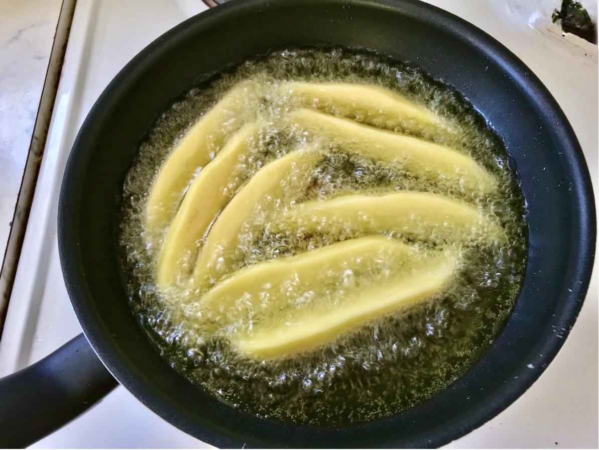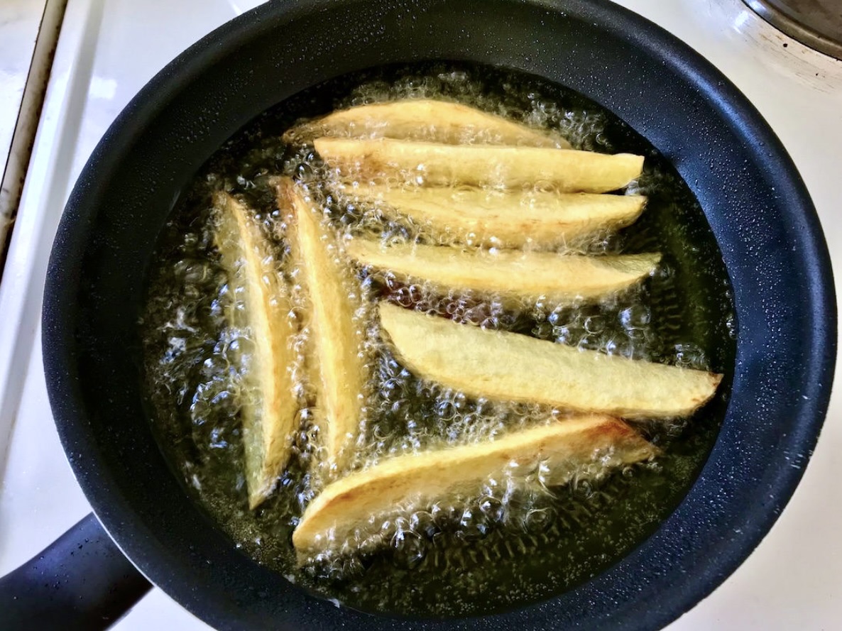 Rozgrzewanie oliwy: Na patelnię wlej tyle oliwy, aby ziemniaki były w niej zanurzone mniej więcej do połowy. Rozgrzej ją do temperatury 150–160°C. Jeśli nie masz termometru, sprawdź temperaturę kropelką wody – powinna skwierczeć.