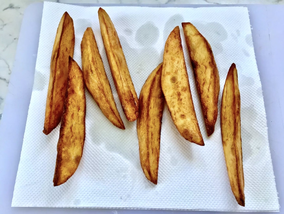 Odsączanie i przyprawianie: Gotowe frytki wyjmij i połóż na ręczniku papierowym, aby pozbyć się nadmiaru tłuszczu.