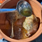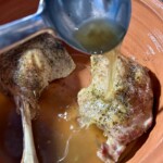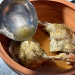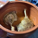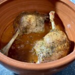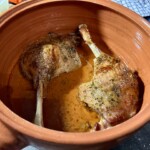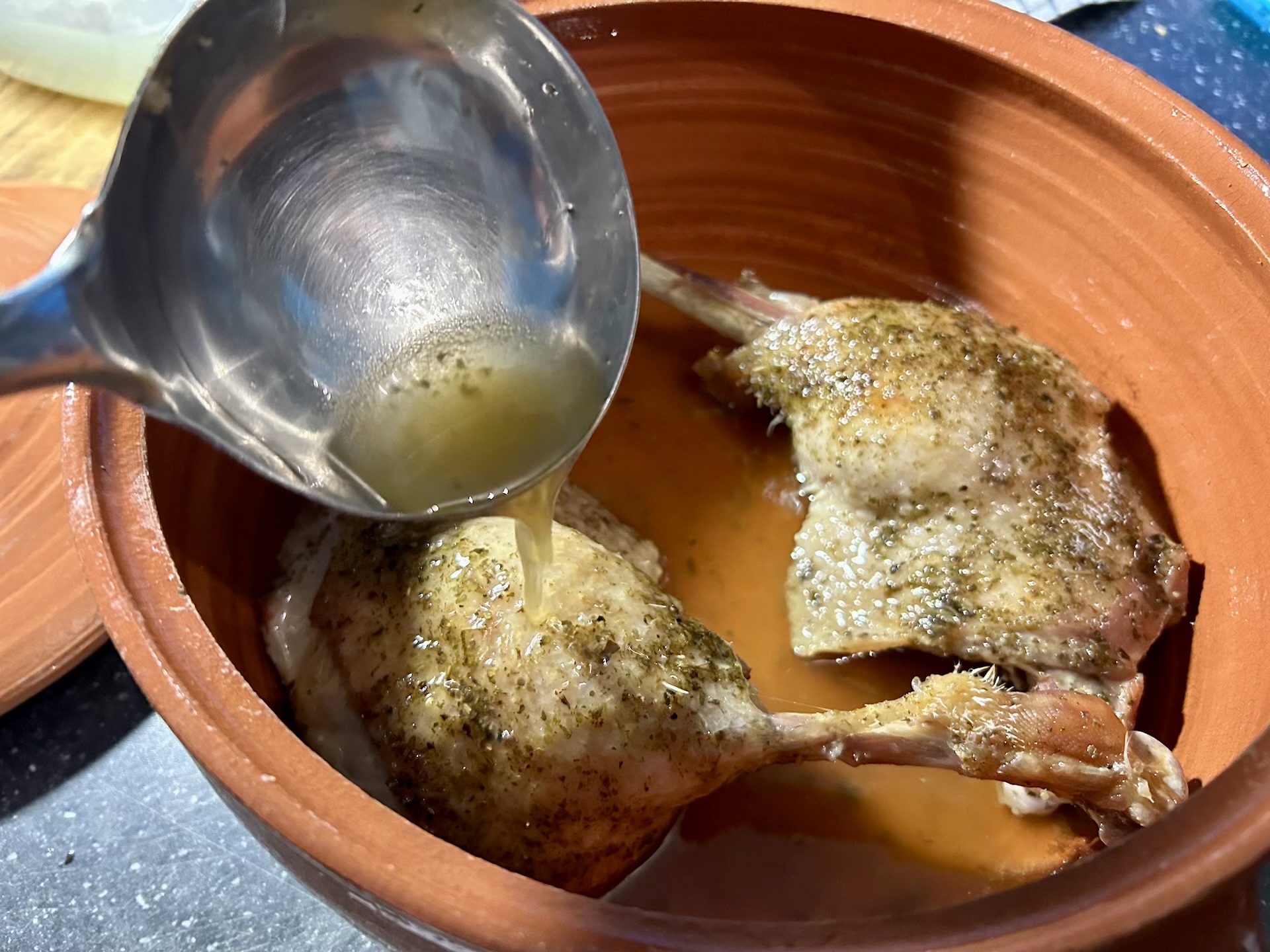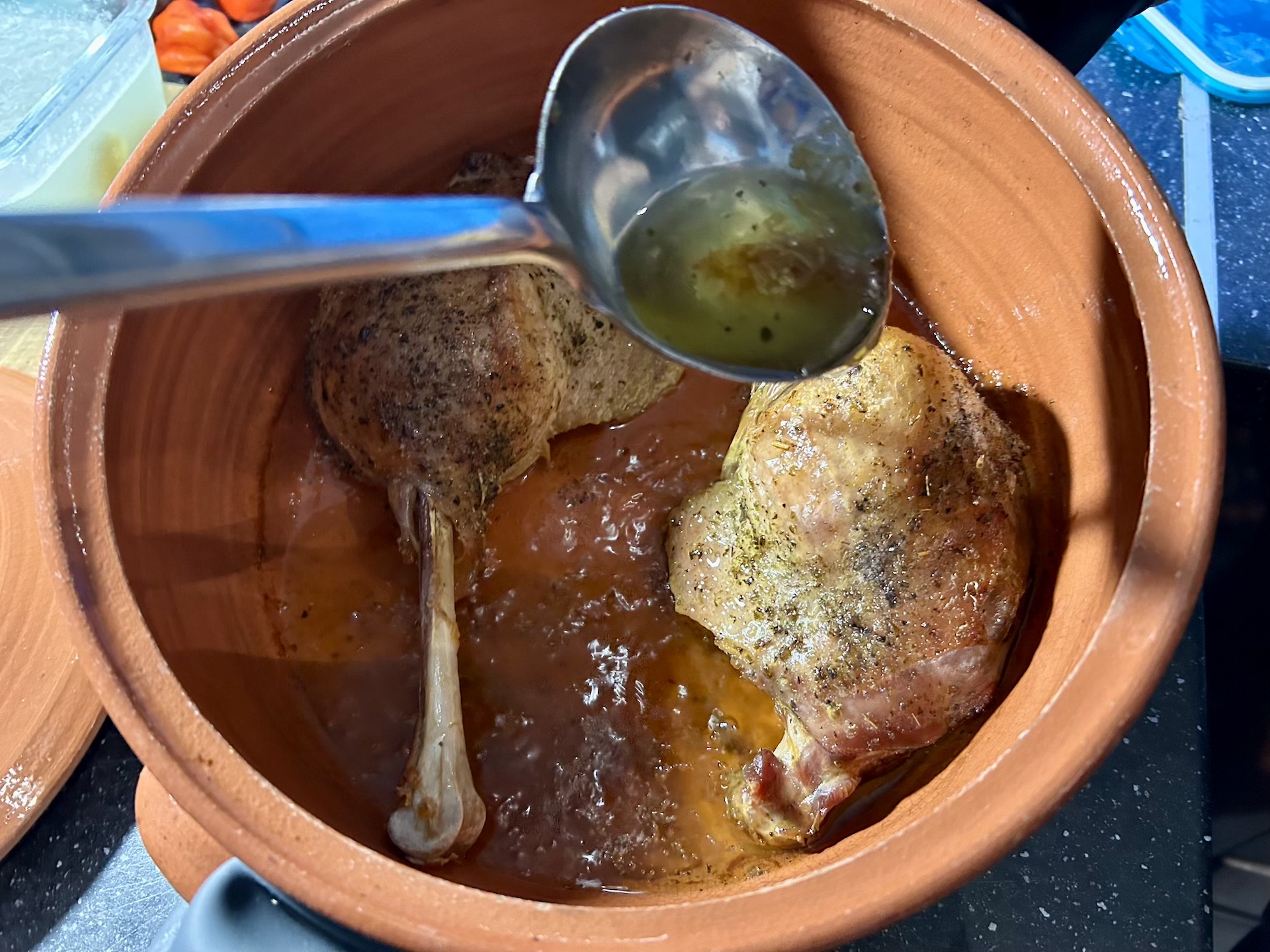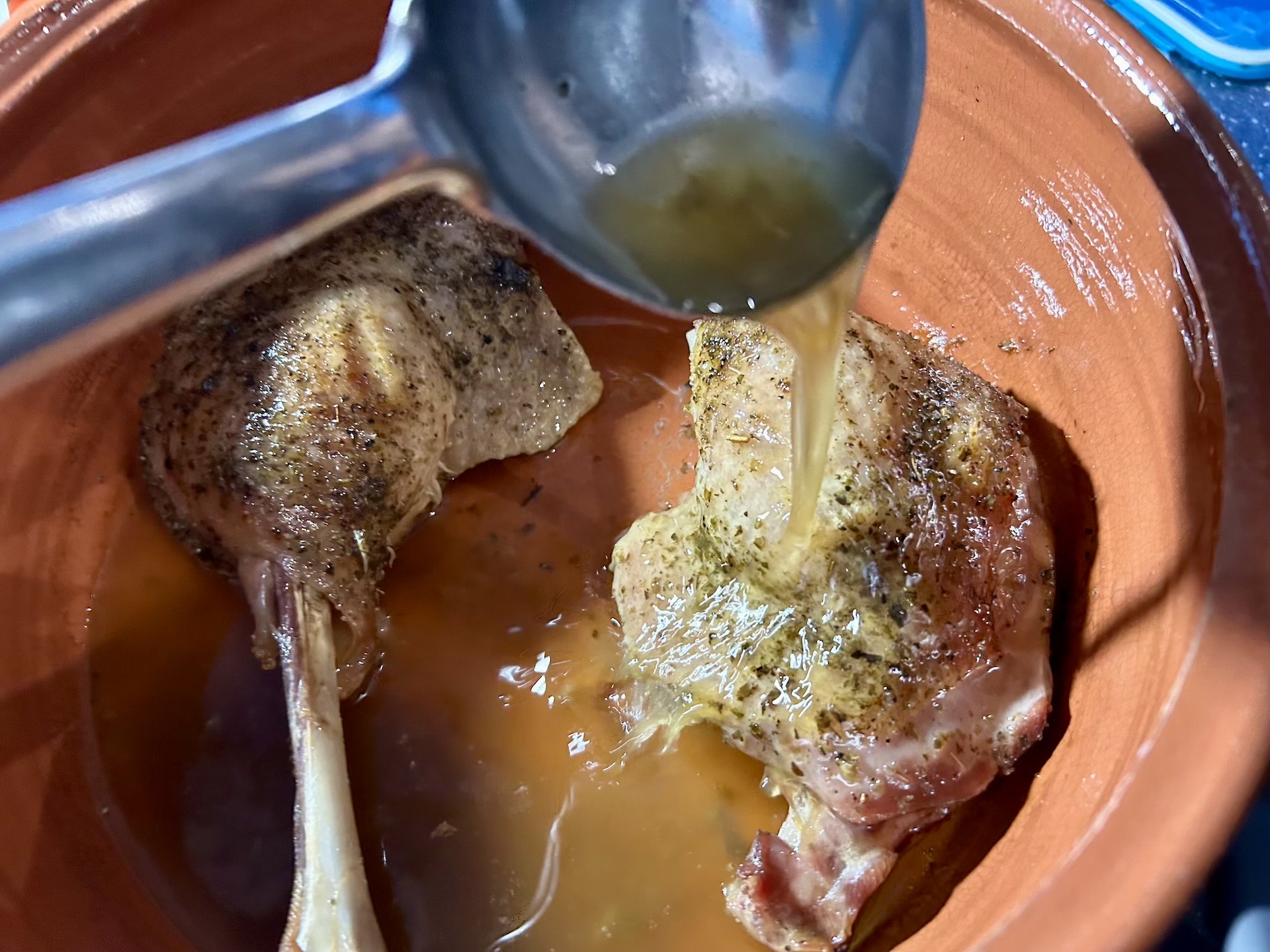 Pieczenie i podlewanie: Po pierwszej godzinie powinien wytopić się tłuszcz. Odsłoń naczynie, a następnie polej nogi wytopionym tłuszczem. Piecz dalej w temperaturze 180°C, wciąż pod przykryciem.