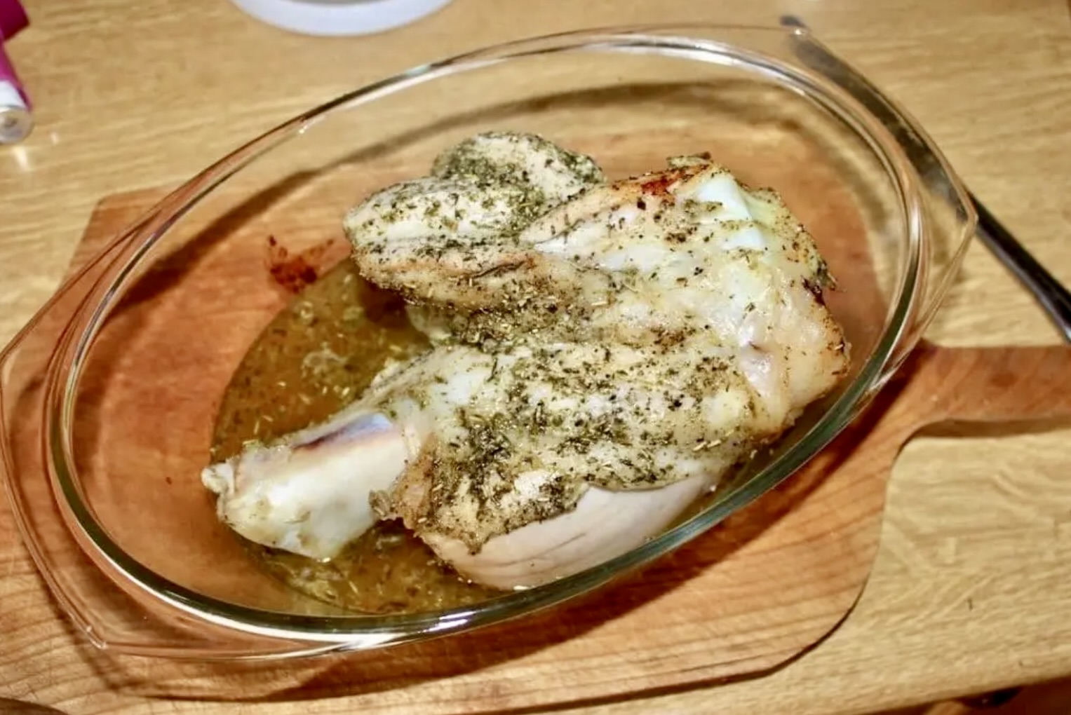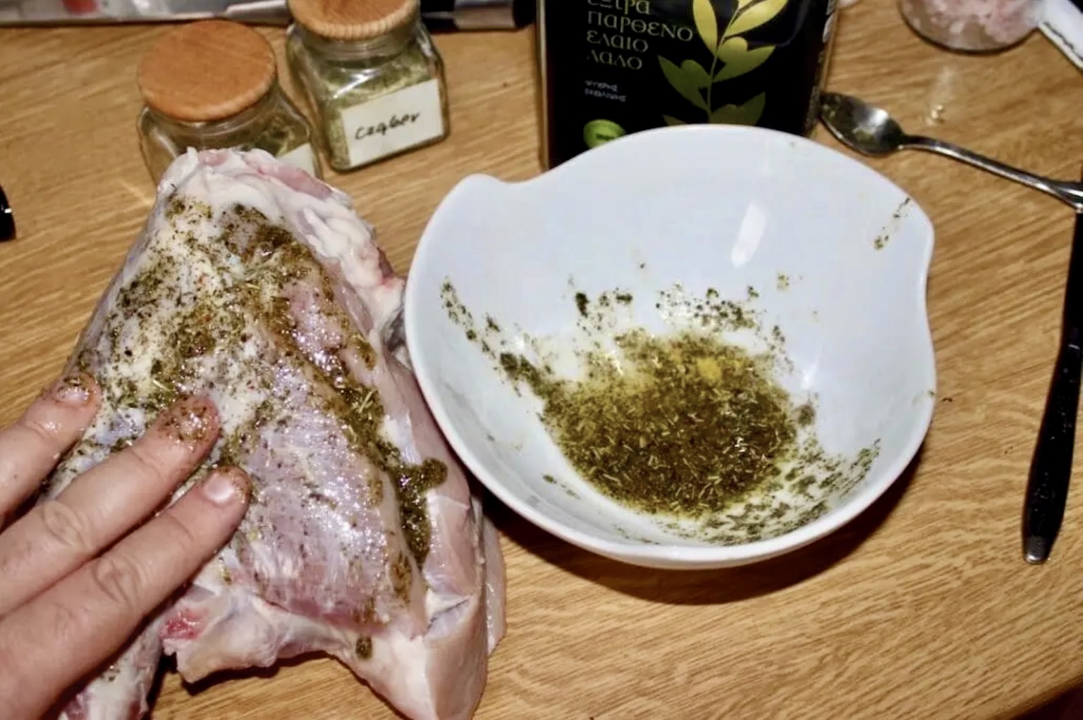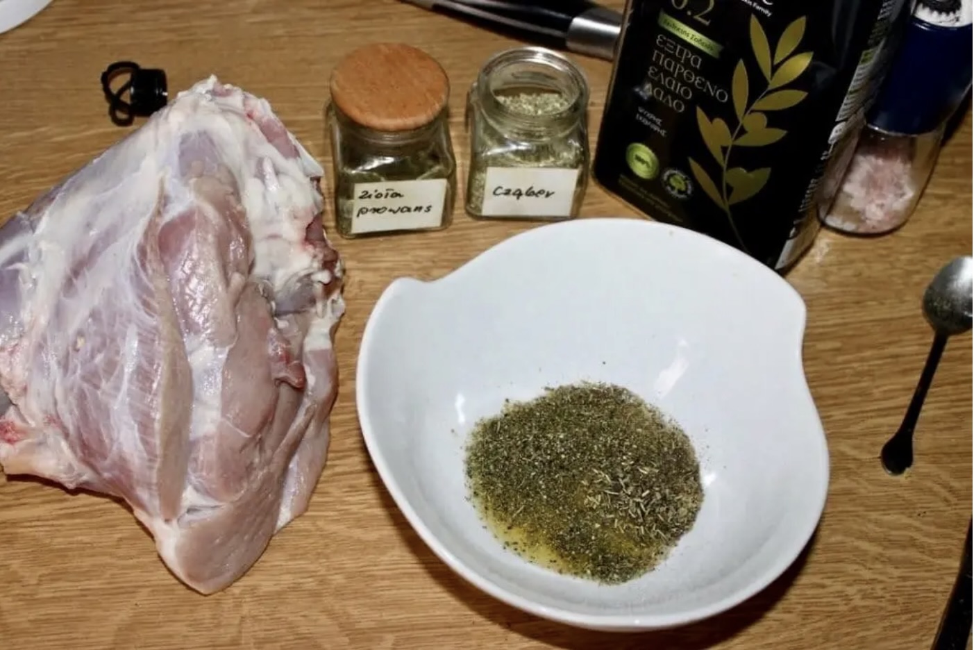 Marynowanie: Mięso dokładnie umyj i osusz papierowym ręcznikiem. W miseczce wymieszaj oliwę, zioła i sól. Tak przygotowaną marynatą starannie natrzyj całą gicz.