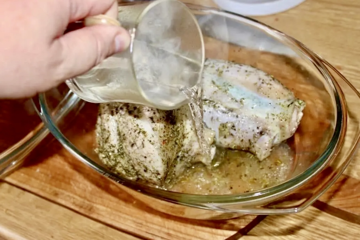 Duszenie: Wyjmij naczynie, wlej do niego szklankę gorącej wody (ważne, by nie była zimna, aby naczynie nie pękło) i zmniejsz temperaturę piekarnika do 150°C. Przykryj naczynie pokrywką i wstaw z powrotem do pieca.