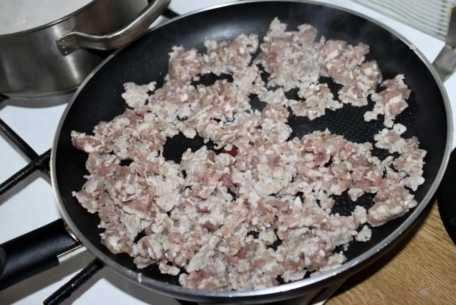 Wyjmij mięso z jelit białej kiełbasy i smaż bez tłuszczu na patelni, aż mięso się zbrązowi. Przełóż do dużej miski.