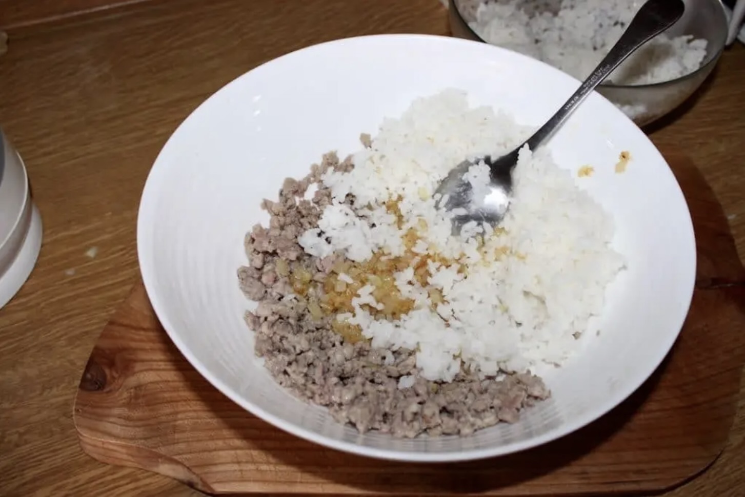 Do mięsa dodaj ugotowany ryż i cebulę.