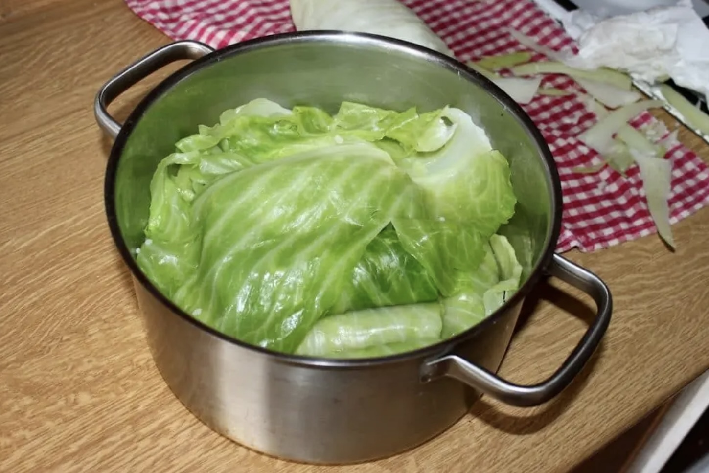 Dno sporego garnka wyłóż liśćmi kapusty.