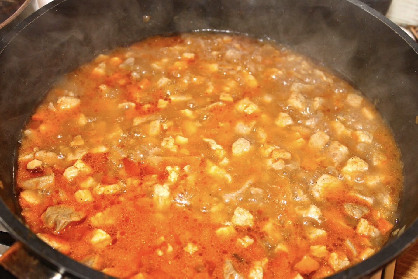 Do mięsa dodaj 1 łyżeczkę suszonych warzyw oraz 1 łyżkę mielonej, słodkiej papryki. Podsmażaj 1 minutę, a następnie wlej około 500 ml wrzącej wody. Przykryj, a następnie gotuj na wolnym ogniu około 45 minut. W razie potrzeby podlewaj wodą.