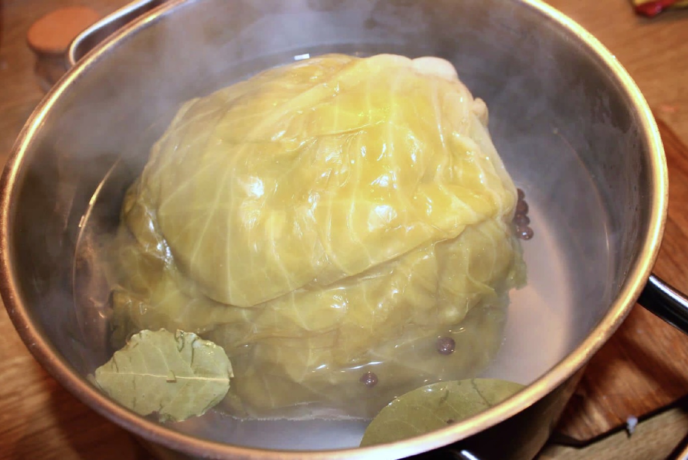 Włóż do dużego garnka, zalej wrzątkiem, dodaj kilka ziarenek ziela angielskiego i listek laurowy.