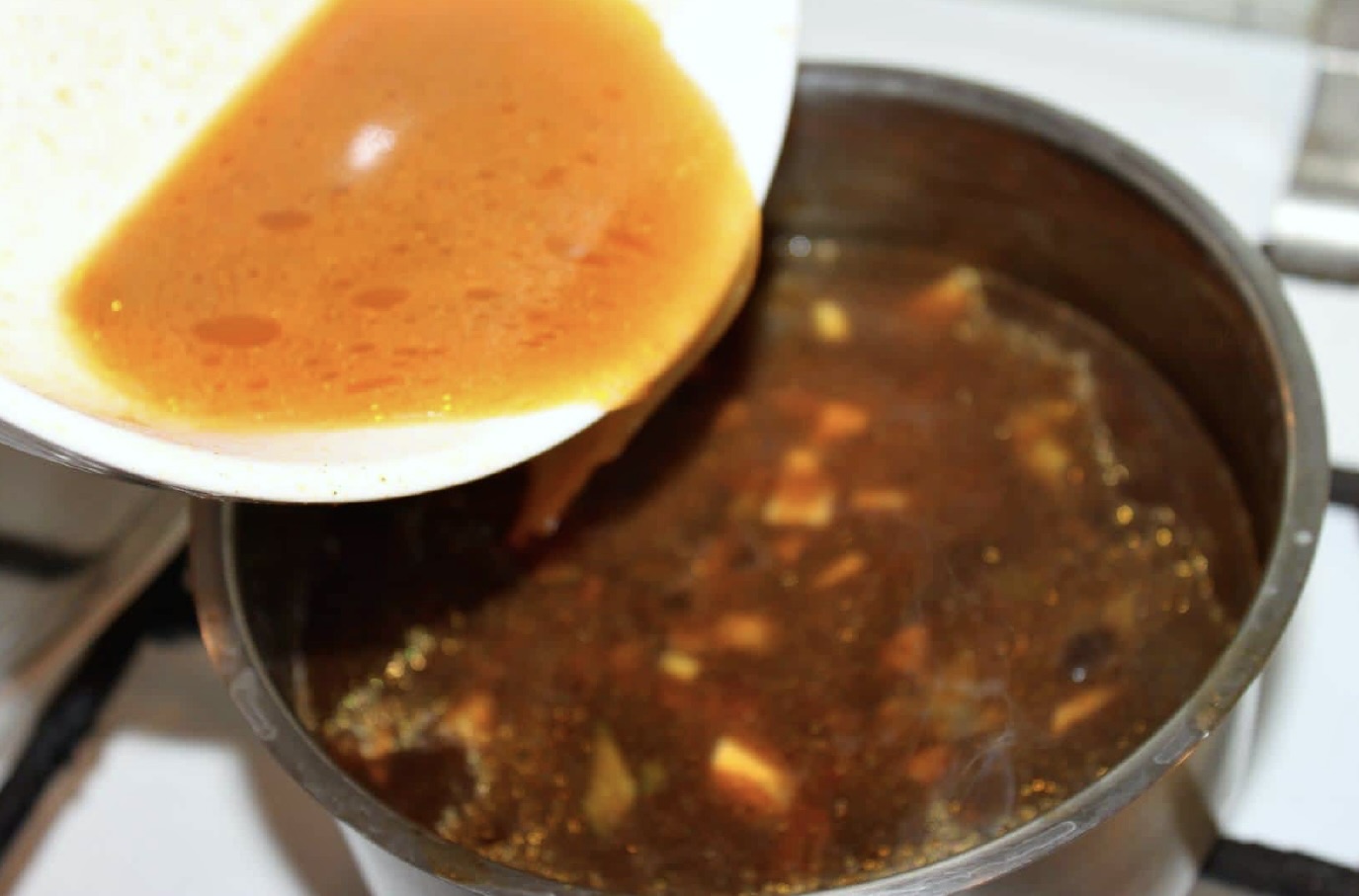 Wlej do niego sos z gulaszu wieprzowego (zachowany wcześniej). Gotuj na wolnym ogniu, aż sos nieco się zredukuje.