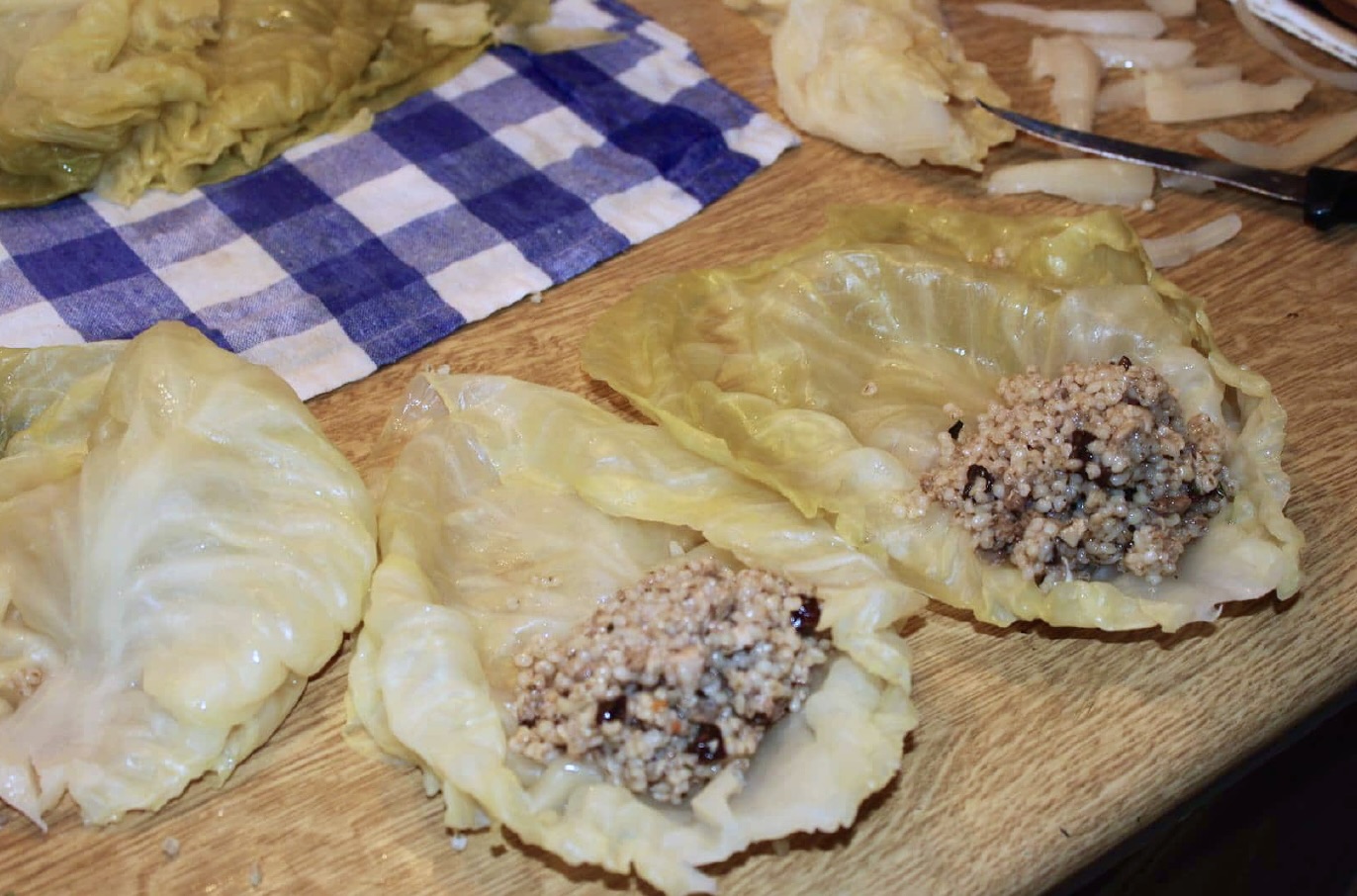 Wyjmij kapustę z garnka, a następnie zdejmij z niej liście. Rozłóż je na ściereczce, aby nieco odsączyć z wody. Z każdego liścia wytnij gruby główny nerw.