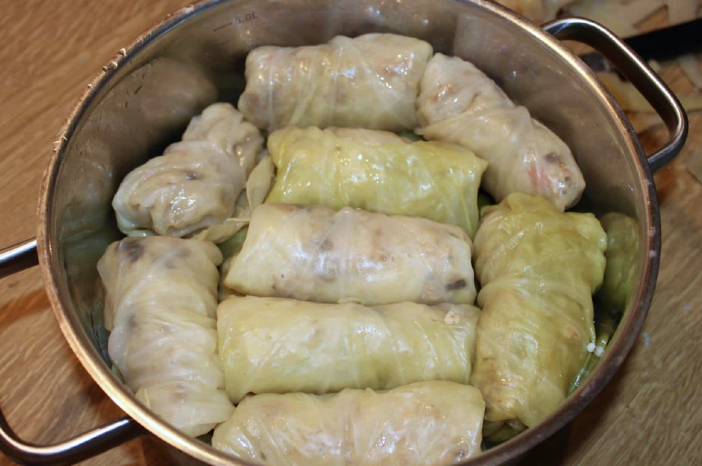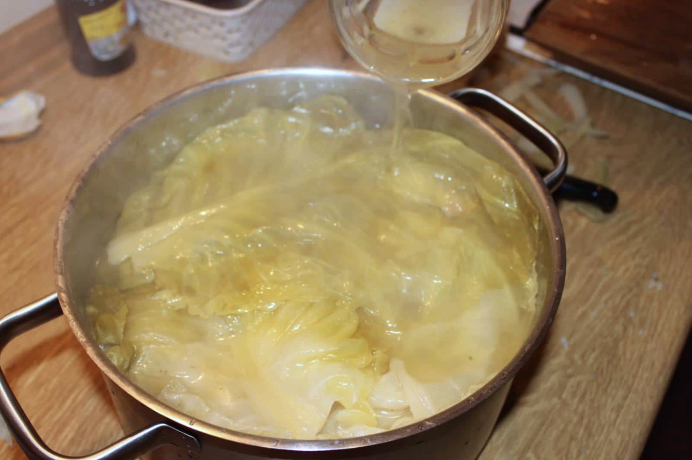 Na dnie dużego garnka rozłóż niewykorzystane liście kapusty.