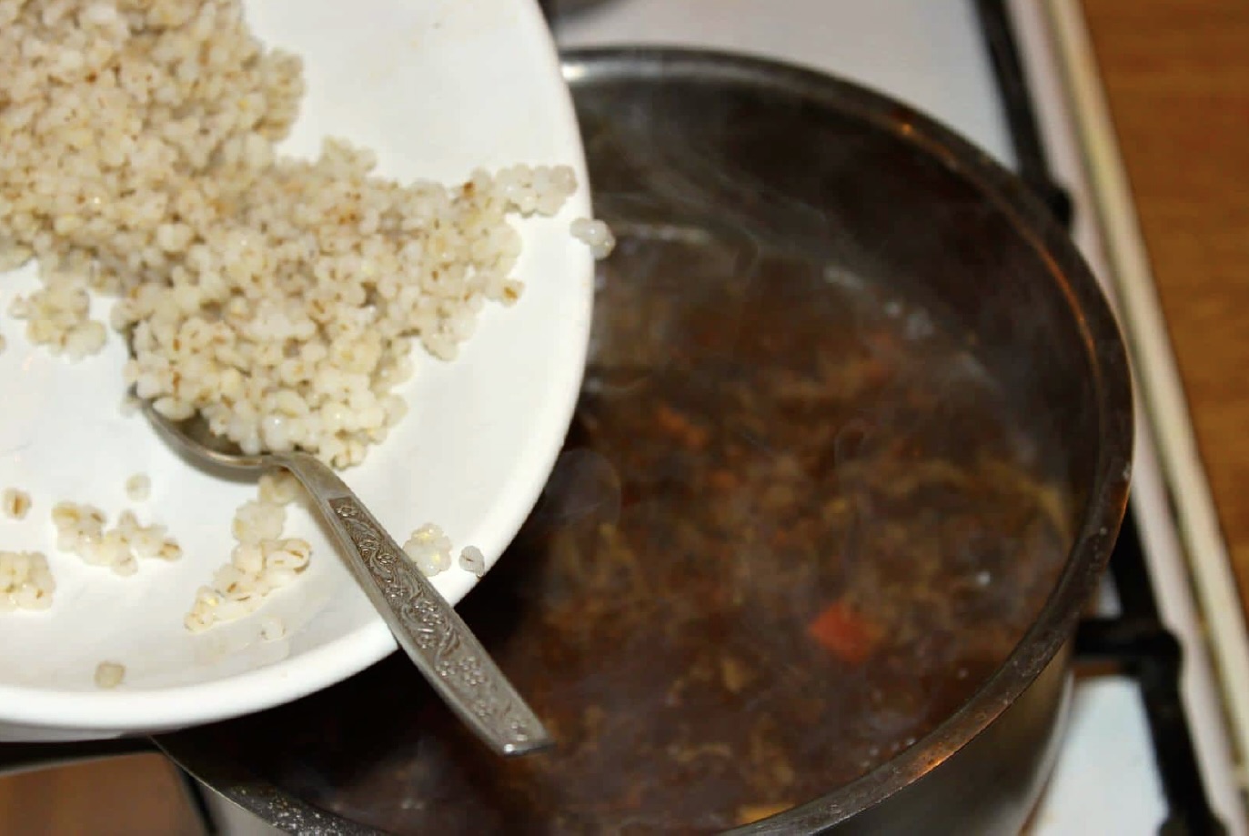 Dodaj odłożone wcześniej 3 łyżki kaszy jęczmiennej.