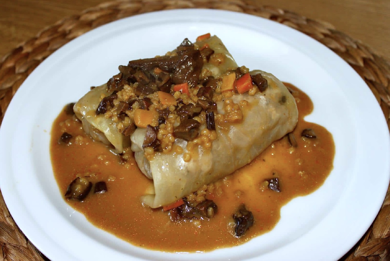 Ugotowane gołąbki podawaj polane sosem grzybowym. Możesz je również podsmażyć na patelni, aby nabrały wspaniałego koloru i smaku.