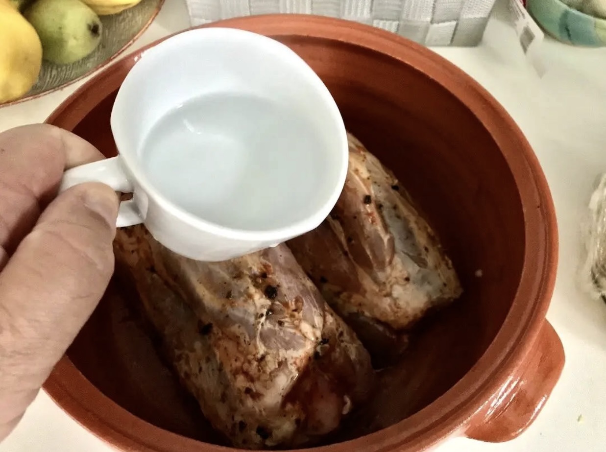 Mięso włóż do naczynia żaroodpornego i wlej filiżankę wody.