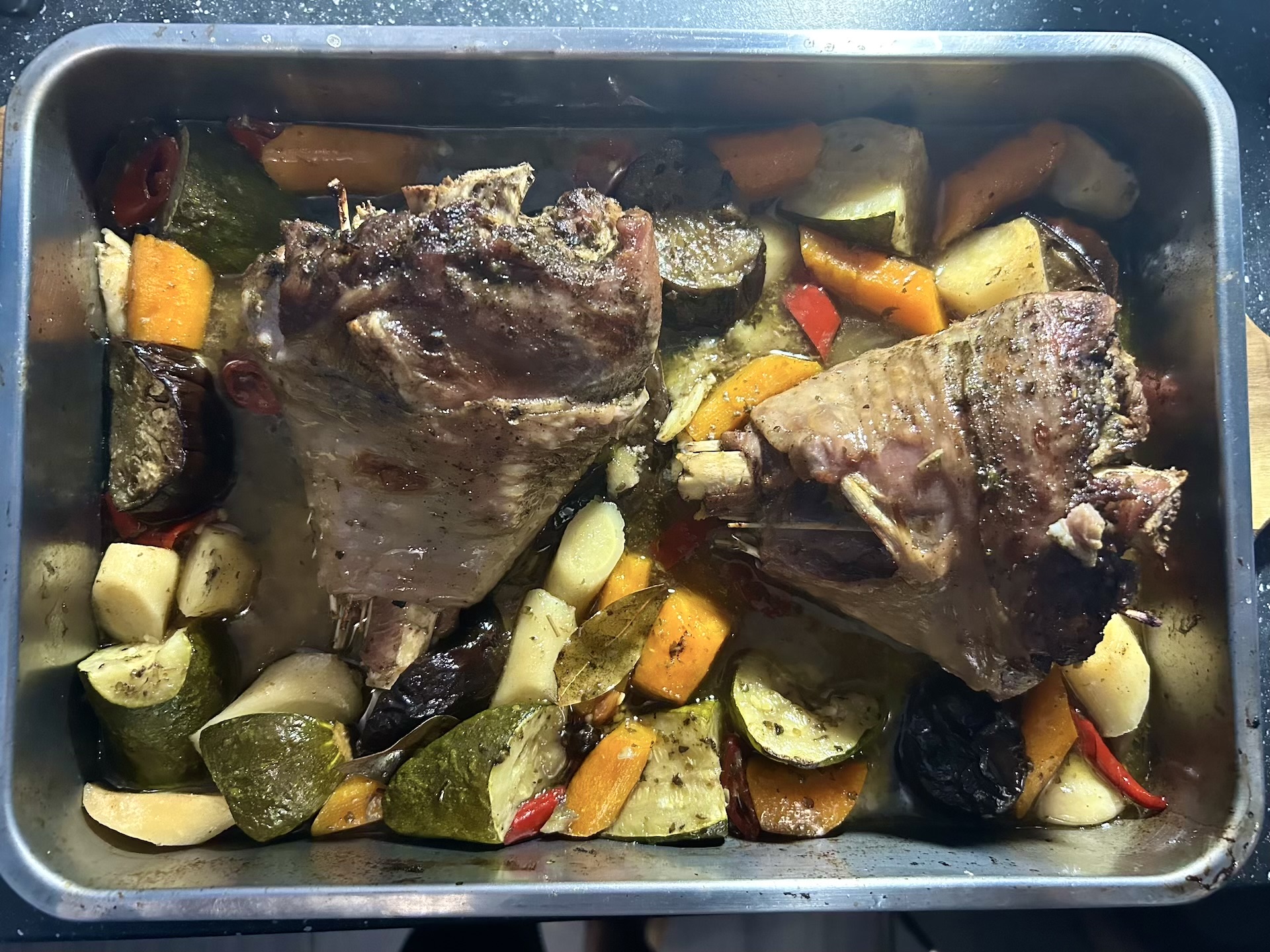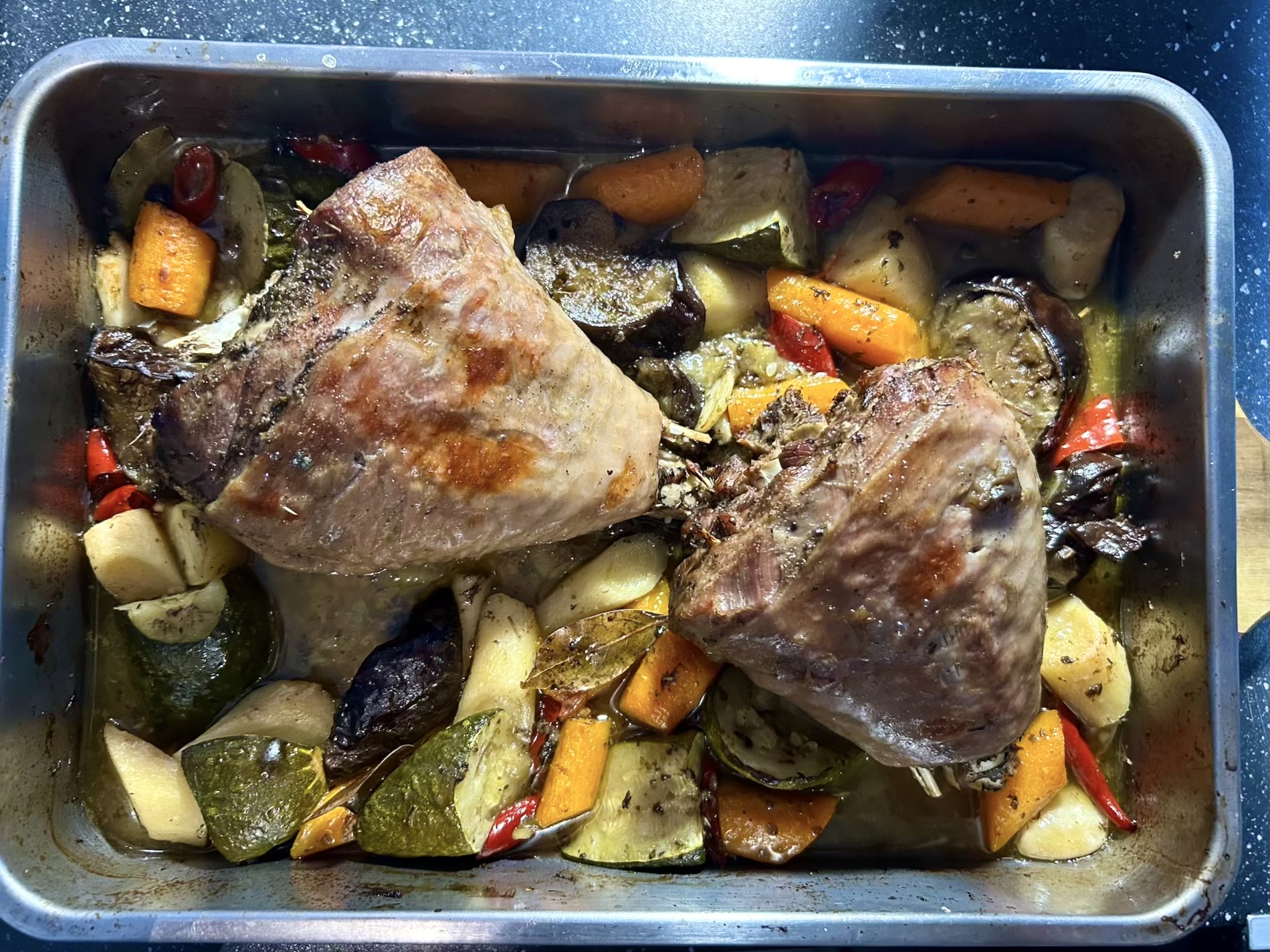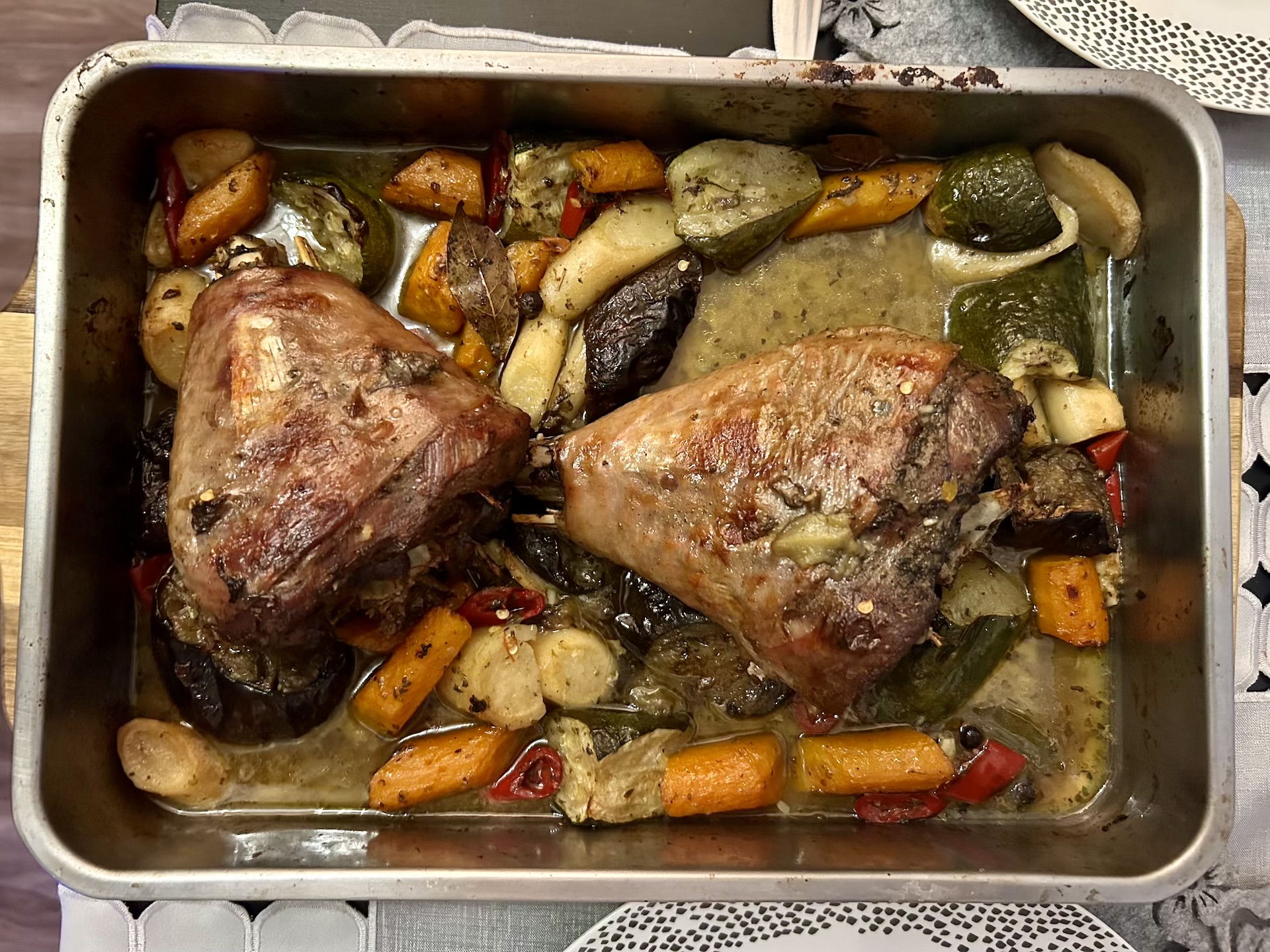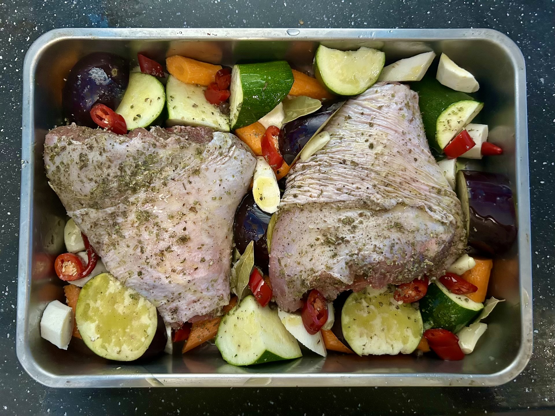 Układanie: W brytfannie umieść golonki, a wokół nich rozłóż warzywa. Całość (mięso i warzywa) polej obficie oliwą i posól warzywa. Na koniec do brytfanny wlej szklankę wody.
