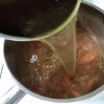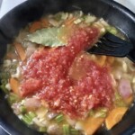 Dodanie bazy: Wlej na patelnię dwie chochelki gorącego bulionu, dodaj starte (lub z puszki) pomidory oraz liść laurowy. Całość zagotuj.