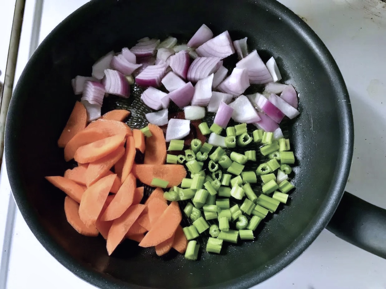 Smażenie warzyw: Marchewkę obierz i pokrój w półplasterki, cebulę posiekaj grubo, a seler naciowy drobno. Na patelni rozgrzej oliwę, a następnie smaż warzywa na średnim ogniu przez 2-3 minuty.