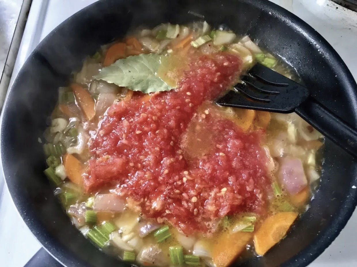 Dodanie bazy: Wlej na patelnię dwie chochelki gorącego bulionu, dodaj starte (lub z puszki) pomidory oraz liść laurowy. Całość zagotuj.