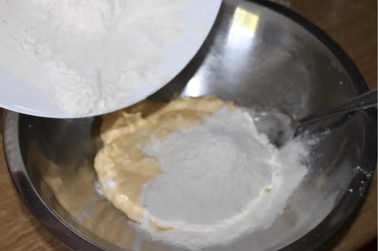 Suche składniki: Przesiej mąkę do miski, dodaj proszek do pieczenia oraz sodę oczyszczoną. Wymieszaj i odstaw na bok.