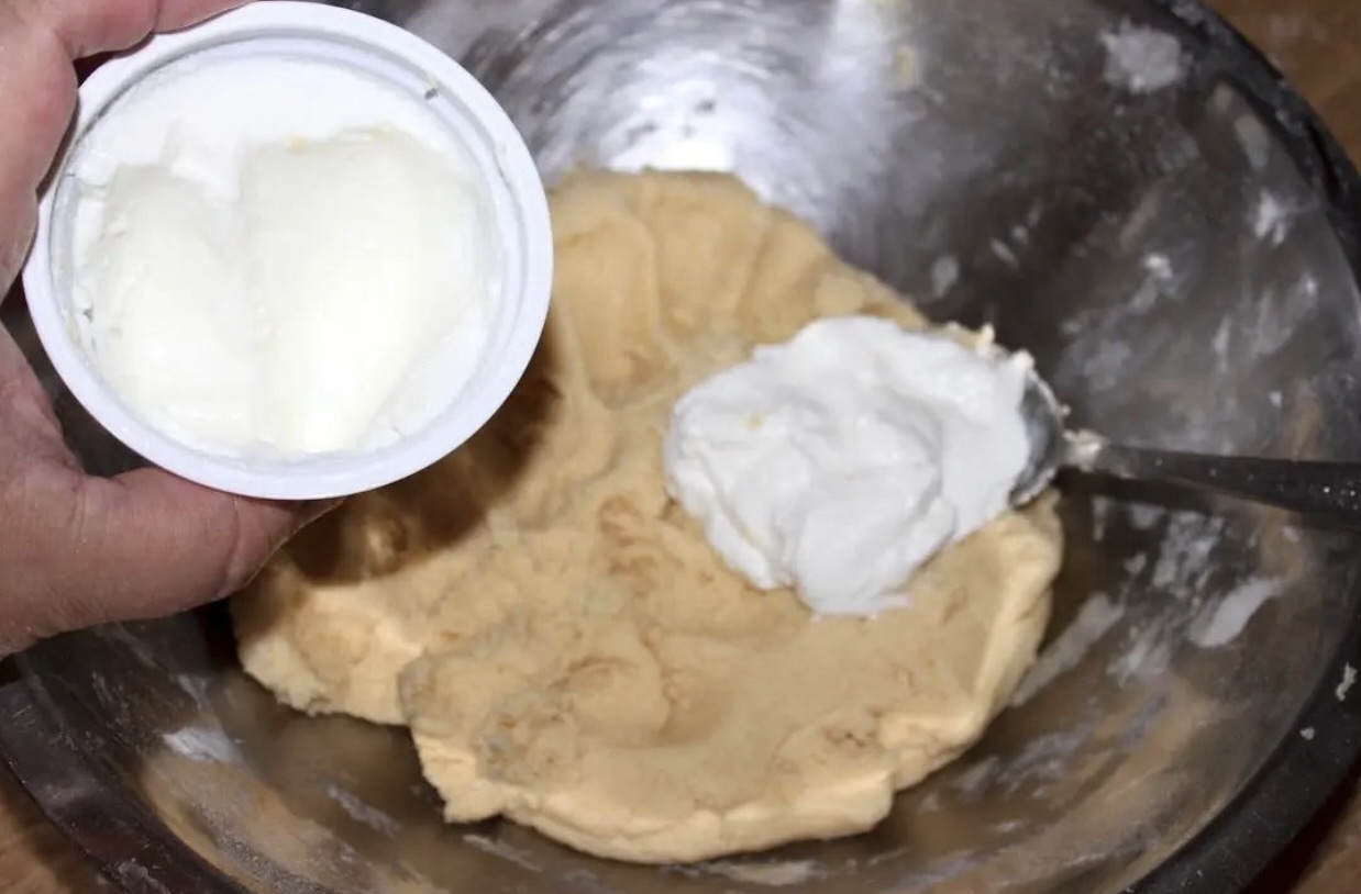 Łączenie składników: Do masy maślanej wsyp przygotowane wcześniej suche składniki i wymieszaj. Następnie dodaj jogurt grecki i ponownie wymieszaj całość.
