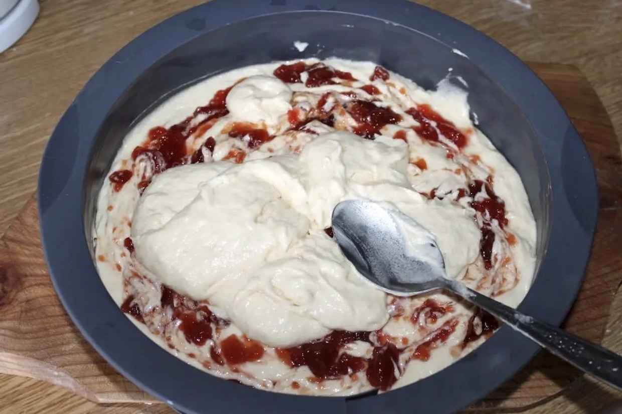 Formowanie: Przygotuj okrągłą formę (np. o średnicy 25 cm), smarując ją masłem. Wyłóż do niej około 3/4 ciasta. Na wierzchu rozłóż dżem i lekko wmieszaj go w ciasto widelcem lub łyżką (dowiedz się jak zrobić konfiturę z grejpfruta). Przykryj resztą ciasta, wyrównując wierzch.