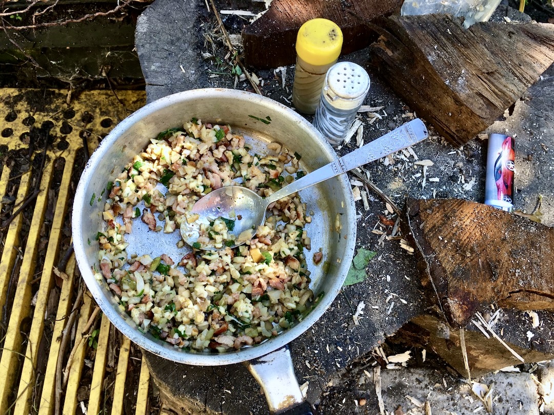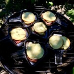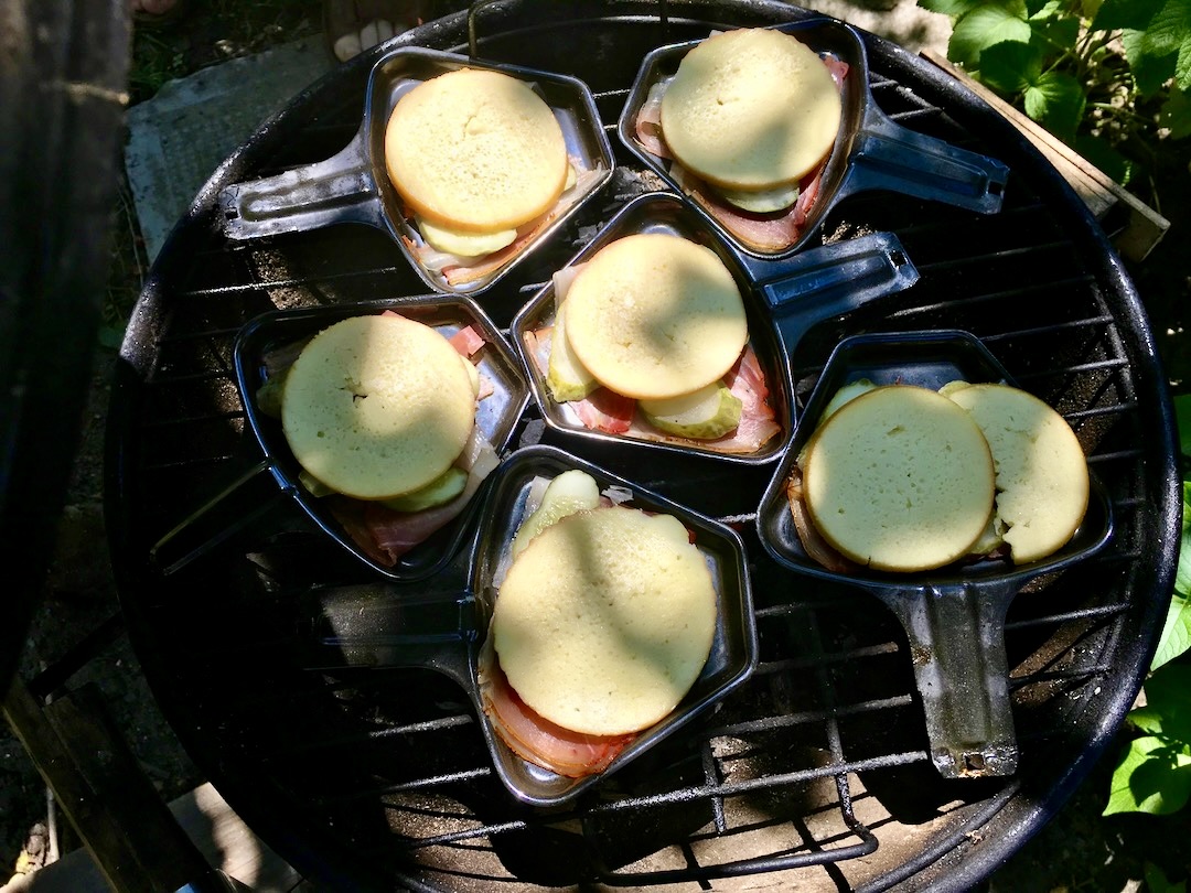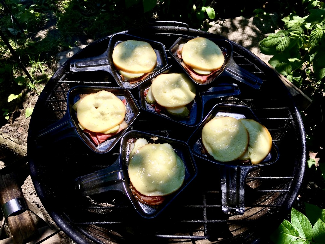 Lubie wykorzystywać minipatelnie, które wypełnić można kilkoma składnikami. Takie malutkie patelenki są elementem wyposażenia szwajcarskich urządzeń typu raclette i doskonale nadają się także na grilla. Zanim zabrałem się za wypełnienie minipatelni najpierw wrzuciłem na ruszt kręciołki z boczku. Takie zwykłe, kupne, gotowe. Szybko się pieką, pozwalają zatem zaspokoić pierwszy głód na grillu. A poza tym wskazują, czy grill jest już dostatecznie rozgrzany, aby wrzucić na niego coś poważniejszego.