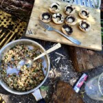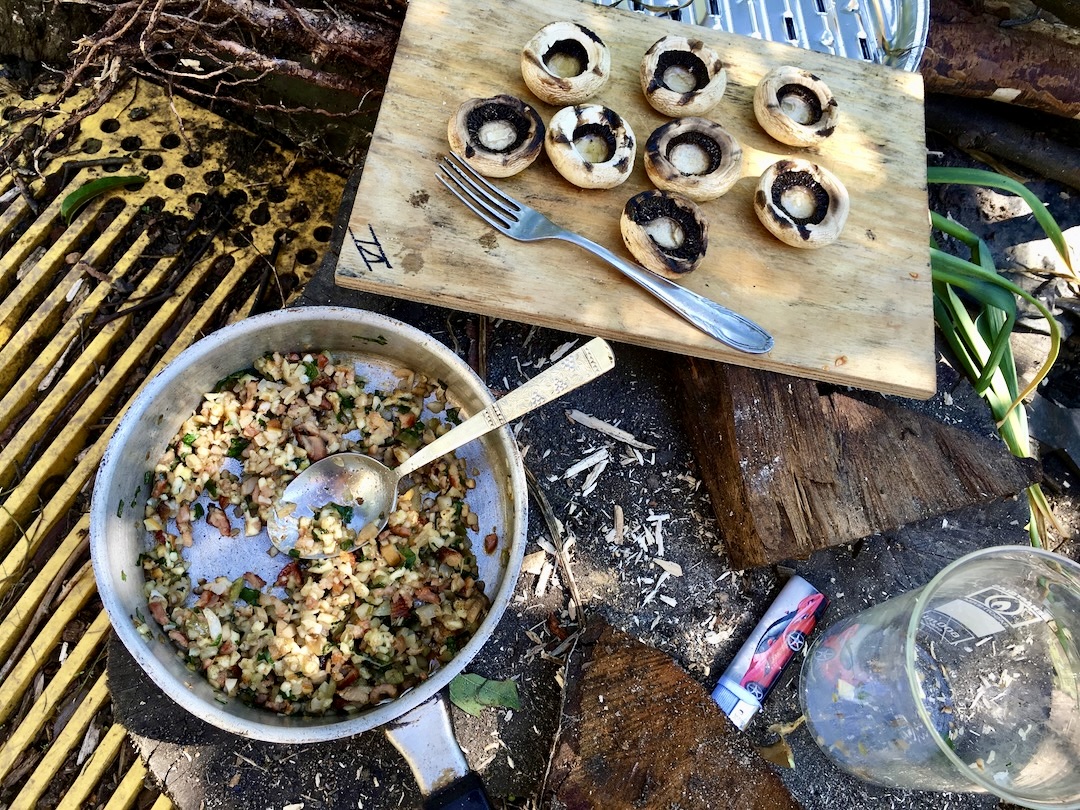 Pieczarki faszerowane to danie oklepane i nie wnoszące nic do naszych kuchni. Ot kawałek dobrego jedzenia, ale bez polotu i większych walorów smakowych. Jakże inaczej jednak smakują pieczarki osmagane dymem z rusztu! A gdy ich kapelusze wypełnić wybornym farszem cóż to za rarytas nam się rodzi, palce lizać. Farsz do takich pieczarek zrobiłem z pozostałości po kręciołkach z upieczonego na wstępie na ruszcie boczku. Do boczku dodałem posiekane nóżki z tychże pieczarek, posiekane ogórki (pikle według uznania), dymkę (białą i zieloną część) oraz z kawałki wędzonego sera żółtego z polskich gór (serek górski, oscypek itd). Powoli, ale dość długo podsmażany na ruszcie farsz nabrał fenomenalnego smaku. Polecam!