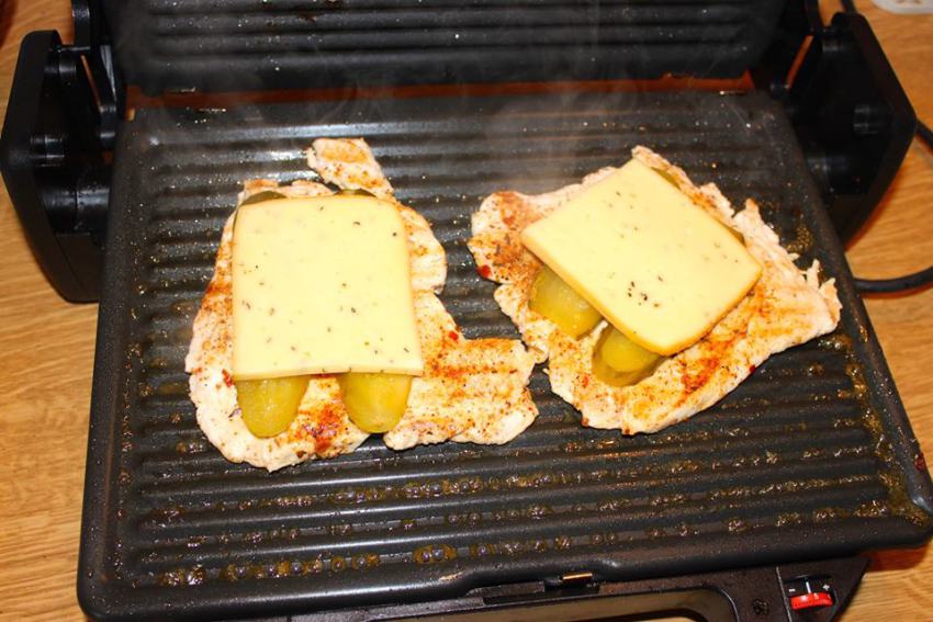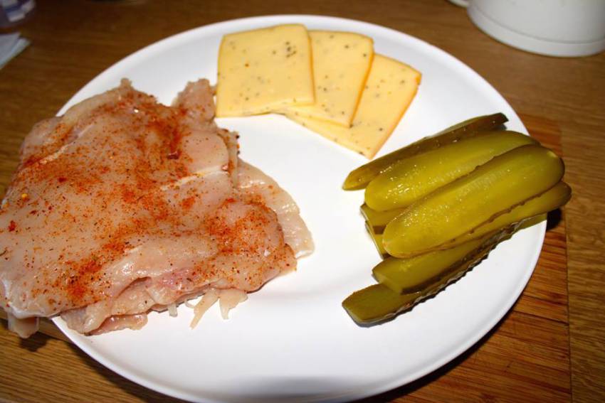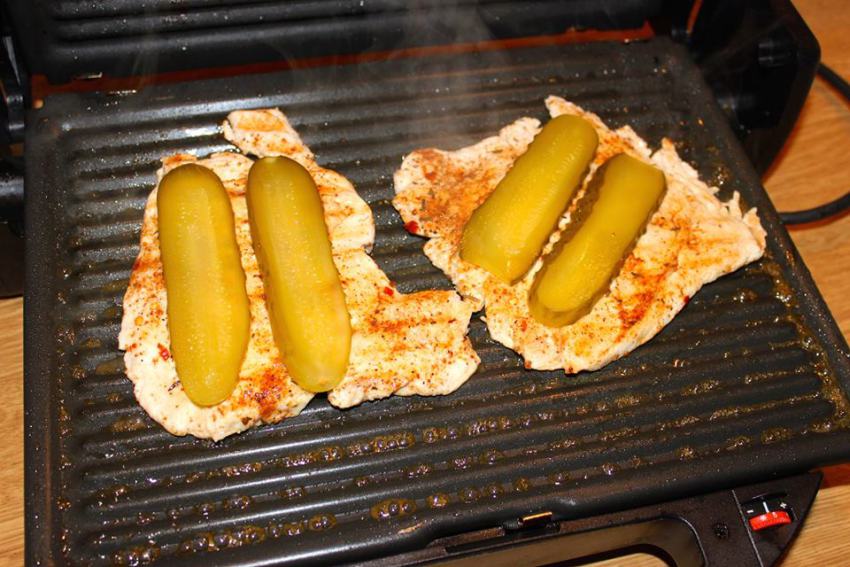 To danie jest niezwykle proste, ale gwarantujące świetne doznania smakowe. Oczywiście pod warunkiem, że spełnione są trzy warunki: dobre ogórki kiszone, piersi kurczaka rozbite na grubość około 1 cm i krótko grillowane, oraz ser dobrze rozpiekający się (np. raclette).