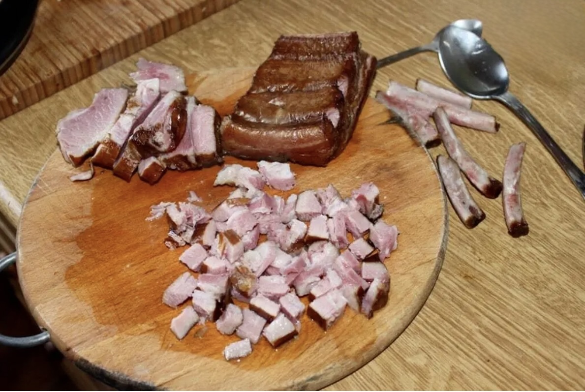 Cebulę oraz wędlinę (szynkę dojrzewającą, boczek lub inne mięso) przesmaż na niewielkiej ilości oleju z dodatkiem masła klarowanego.