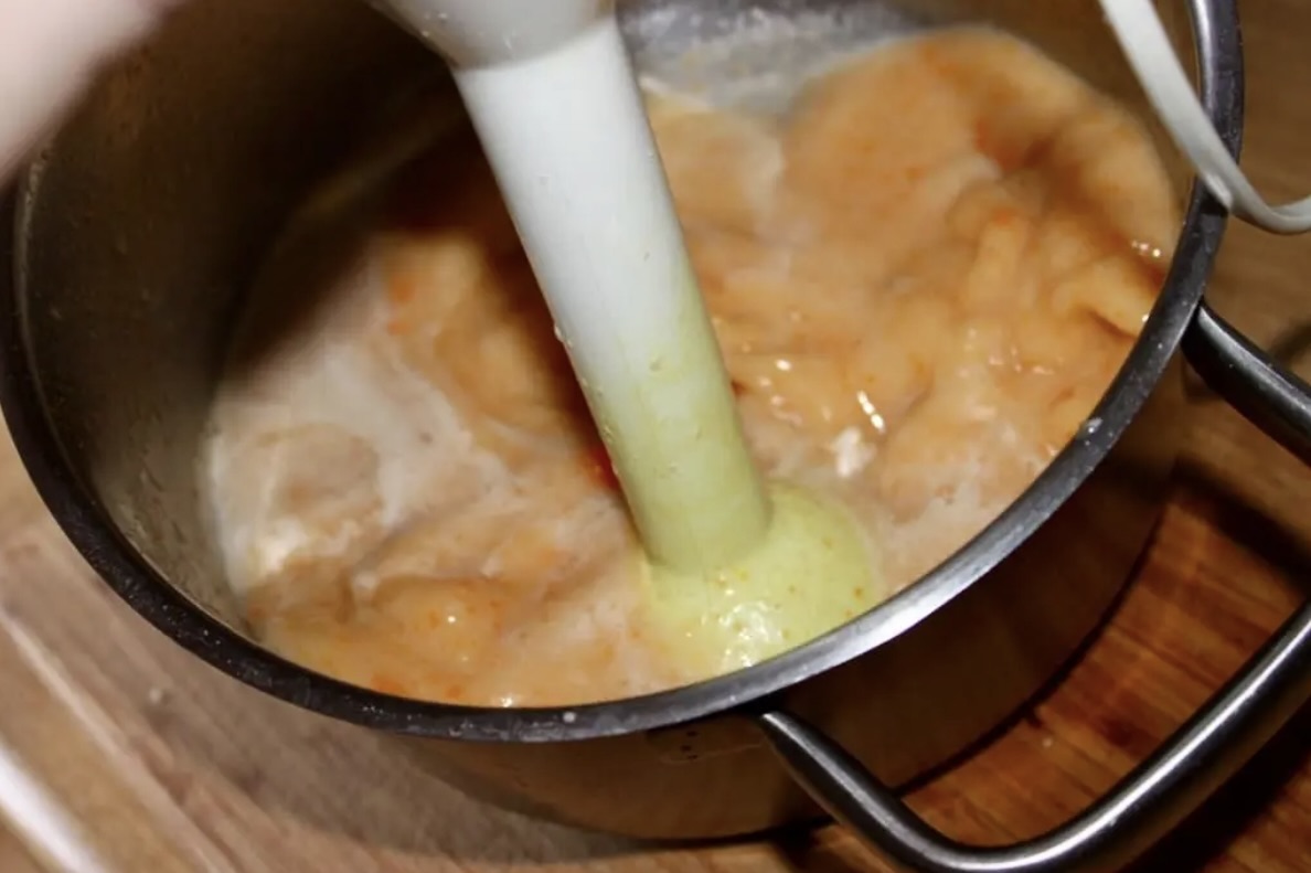 Wywar z gotowania żeberka powinien mieć nie więcej niż 500 ml. Zmiskuj warzywa w wywarze na dość gładką masę.