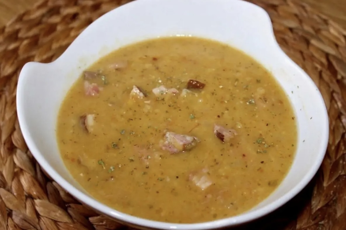 Całą zupę zmiksuj krótko, pulsacyjnie, aby była bardziej aksamitna, ale nadal wyczuwalne były kawałeczki grochu. Uwaga: Na tym etapie zupa jest rzadka, ale zgęstnieje po kilku godzinach, gdy groch napęcznieje.