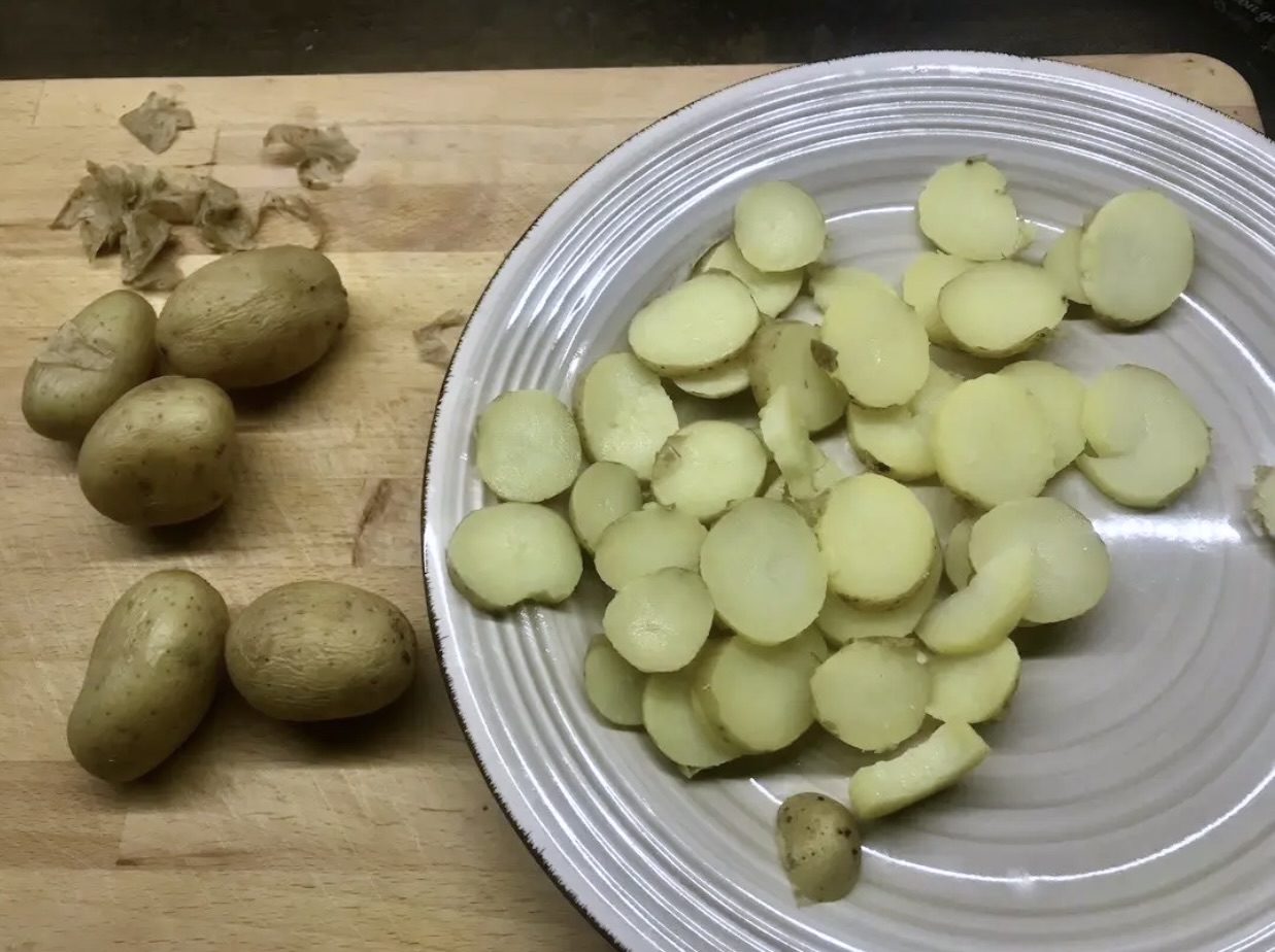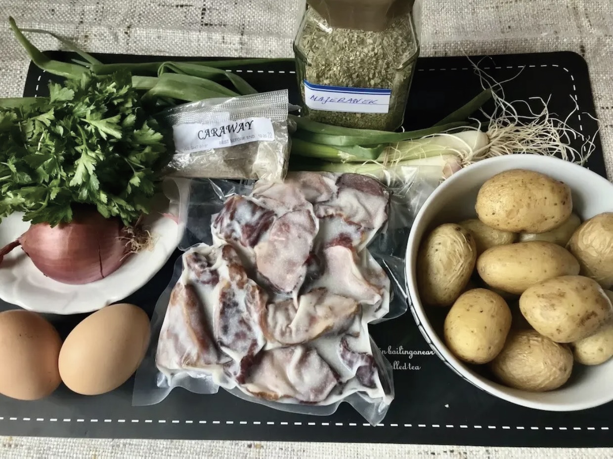 Ziemniaki do tego dania muszą być ugotowane i przestudzone. Najlepiej, jeśli będą z poprzedniego dnia, i najlepiej prosto z lodówki. Wędzonka dowolna byle wieprzowa, a jeśli będzie z tłuszczykiem (jak moja) będzie idealnie.