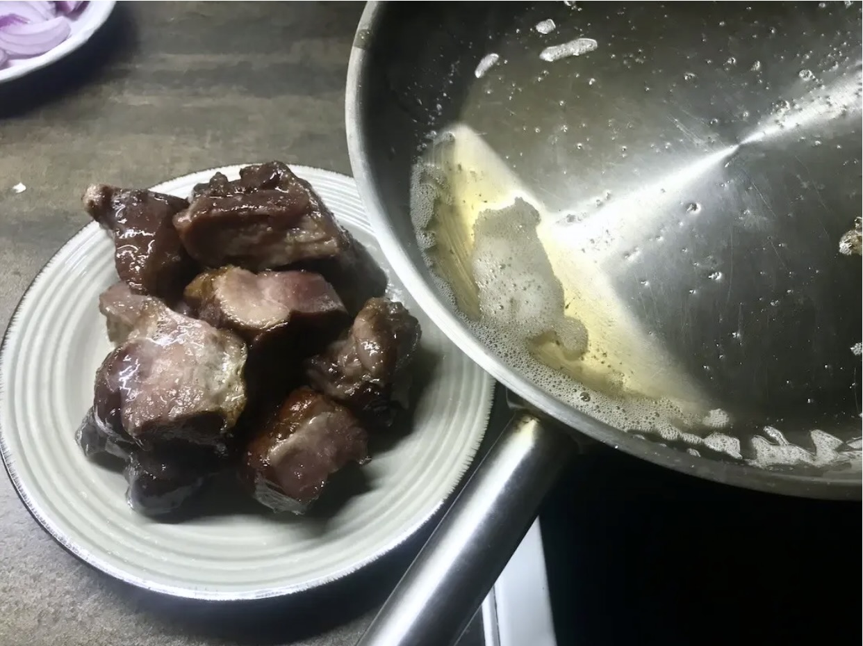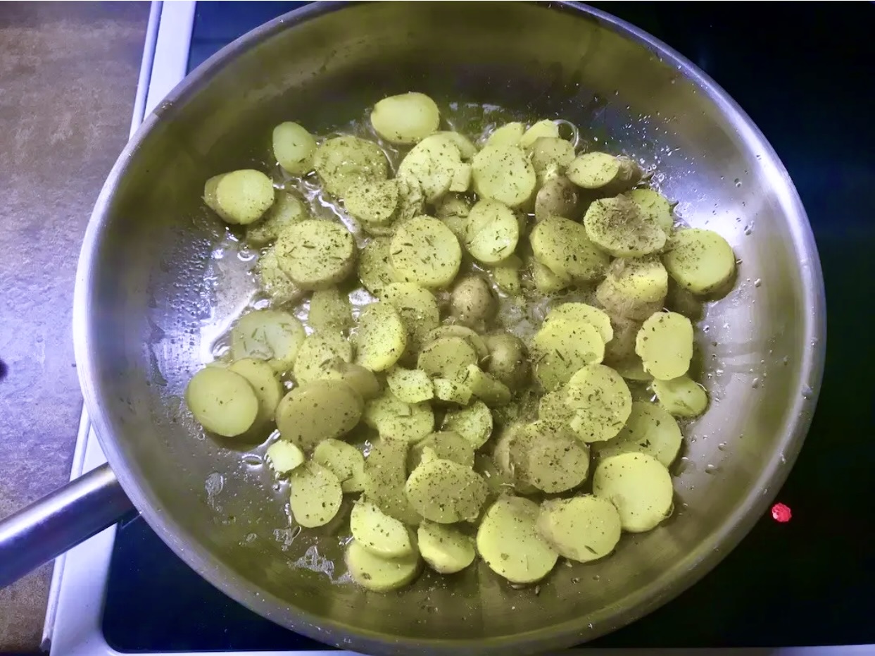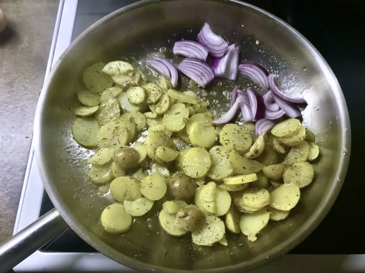 Na podgrzany na patelni gęsi smalec (alternatywnie możesz użyć smalec domowy.) wrzuć pokrojone w plastry ziemniaki. Dodaj pieprz a także majeranek i kminek. Smaż chwilę na dość dużym ogniu, aby ziemniaki się lekko zrumieniły. Następnie wrzuć na patelnię cebulę i smaż dalej całość.