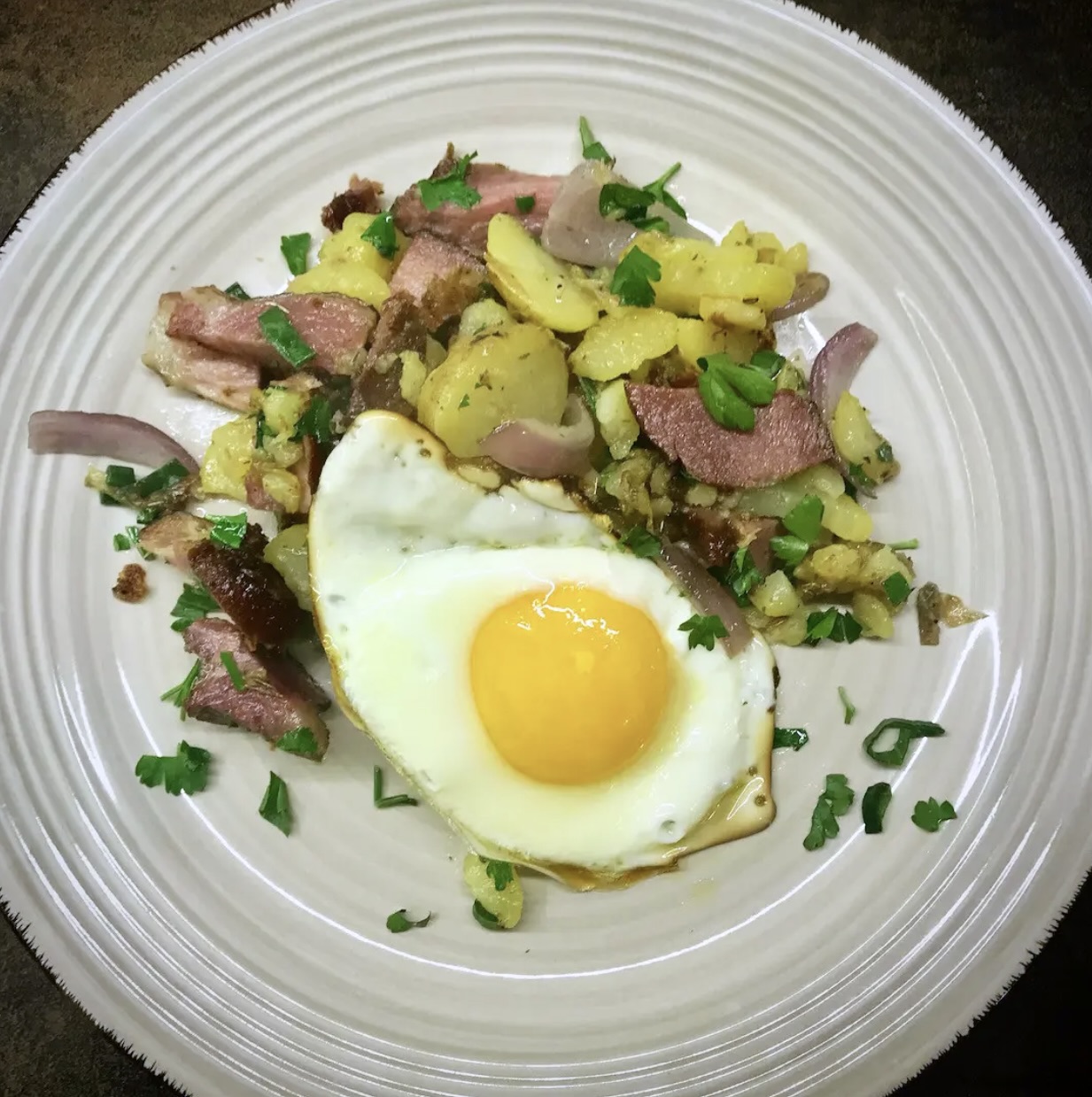 Wrzuć na patelnię pokrojoną w nieduże kawałki wędzonkę. Smaż jedynie tyle, aby i ona się podgrzała. W razie potrzeby posól całość. Wyłącz ogień pod patelnią, a następnie wrzuć posiekane i zioła i delikatnie zamieszaj całość podrzucając patelnią. Podawaj od razu po przygotowaniu w towarzystwie jajka sadzonego. Do tego dania świetnie pasuje domowa kapusta kiszona.