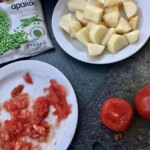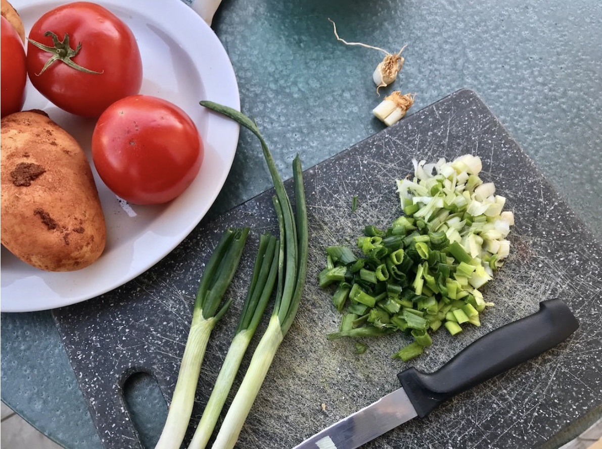 Przygotowanie warzyw: Dymkę pokrój dość drobno. Ziemniaki obierz i pokrój w kostkę. Pomidory zetrzyj na tarce o dowolnych oczkach.