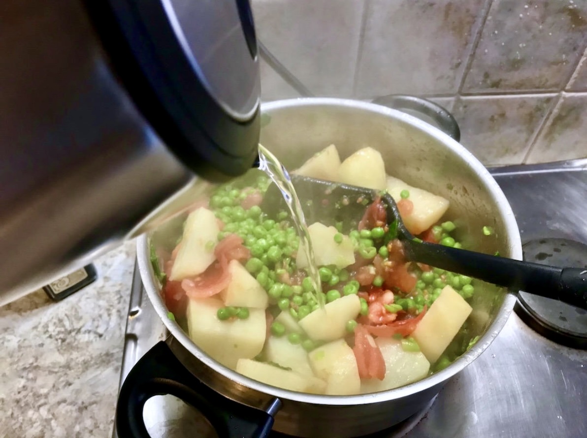 Dodanie ziemniaków: Do groszku dorzuć pokrojone ziemniaki i smaż całość kolejne 2-3 minuty.