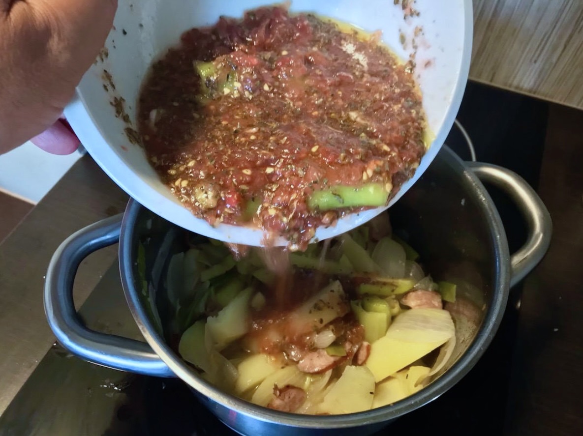 Przyprawione pomidory przelej do garnka z warzywami i kiełbasą, a następnie przykryj garnek pokrywką i duś wszystko 5-10 minut.