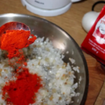 Dodanie papryki: Zdejmij patelnię z ognia. Wsyp na zeszkloną cebulę 2 kopiate łyżki słodkiej mielonej papryki. Wymieszaj, aby powstała jednolita gęsta pasta (ważne: jeśli papryka się przypali, całe danie zgorzknieje).