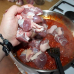 Duszenie wstępne: Postaw patelnię z powrotem na gaz. Wlej pół szklanki gorącej wody i zamieszaj. Następnie wrzuć mięso, dokładnie wymieszaj, aby było całe pokryte paprykową pastą. Wlej kolejne pół szklanki gorącej wody.