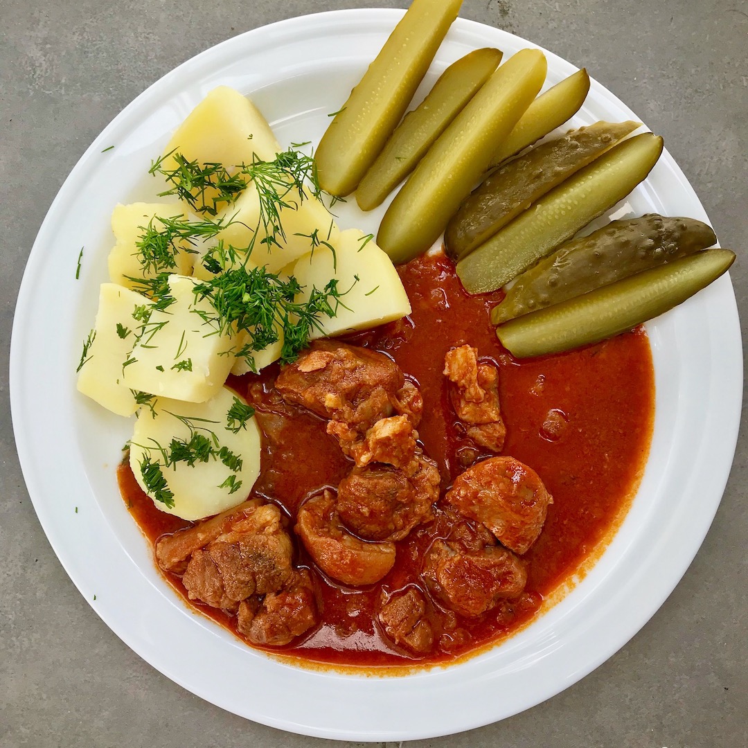 Podanie: Prawdziwy gulasz węgierski powinien mieć mało płynu, być gęsty i zawiesisty. Podawaj tradycyjnie z kluseczkami i kiszonkami lub po polsku – z ziemniakami i ogórkiem kiszonym.