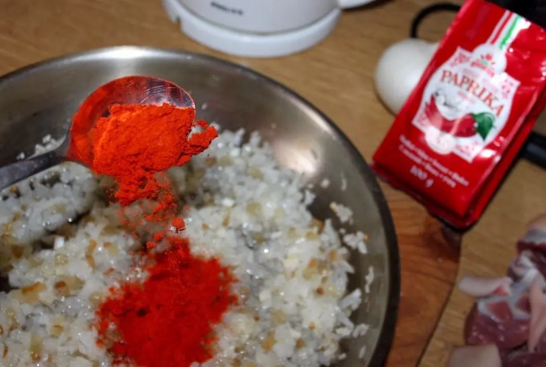 Dodanie papryki: Zdejmij patelnię z ognia. Wsyp na zeszkloną cebulę 2 kopiate łyżki słodkiej mielonej papryki. Wymieszaj, aby powstała jednolita gęsta pasta (ważne: jeśli papryka się przypali, całe danie zgorzknieje).