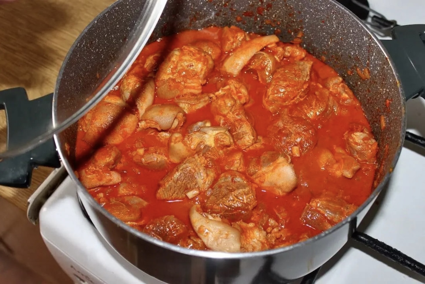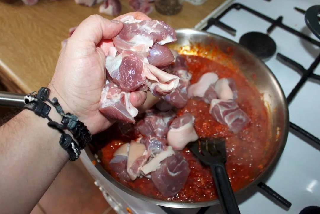 Duszenie wstępne: Postaw patelnię z powrotem na gaz. Wlej pół szklanki gorącej wody i zamieszaj. Następnie wrzuć mięso, dokładnie wymieszaj, aby było całe pokryte paprykową pastą. Wlej kolejne pół szklanki gorącej wody.