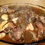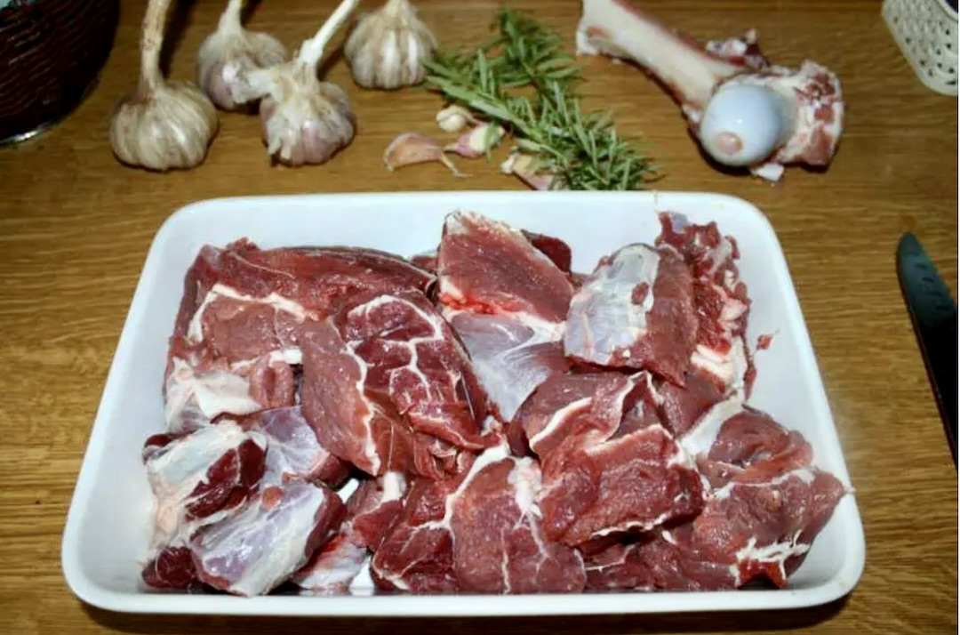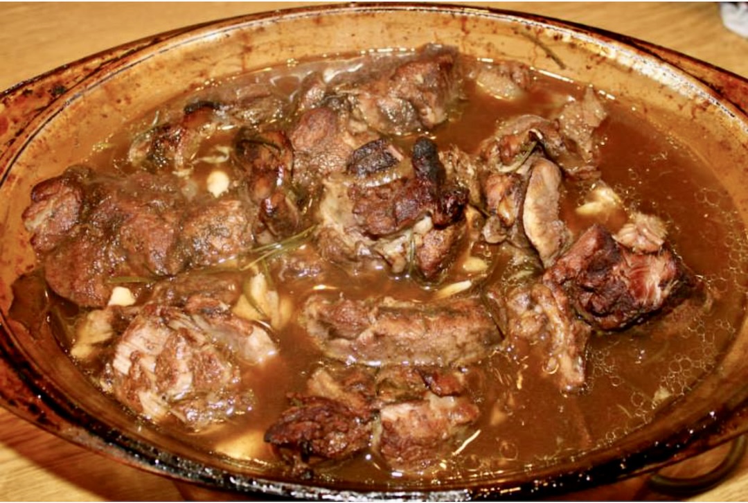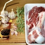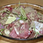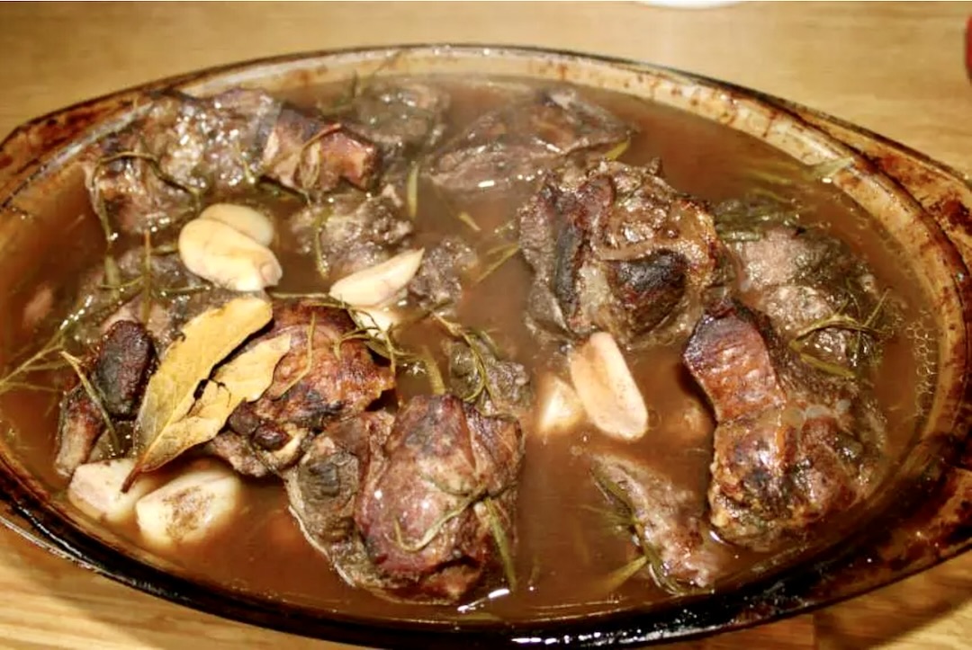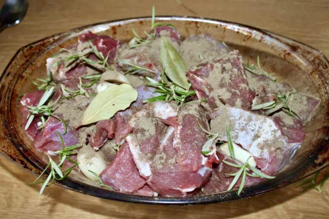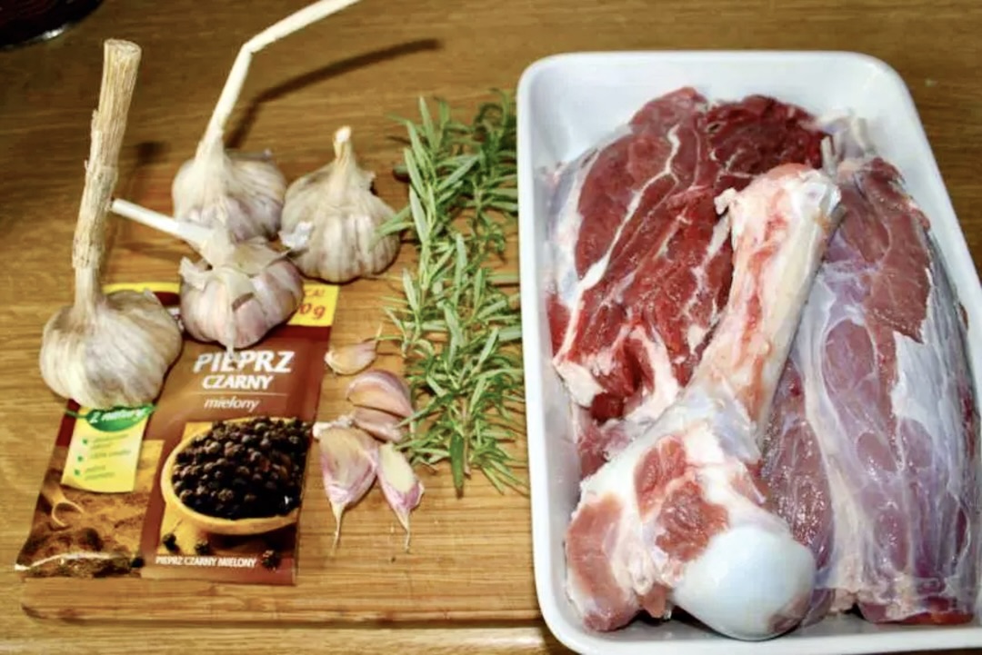 Układanie warstw: Na dnie naczynia żaroodpornego ułóż warstwę mięsa. Pomiędzy mięsem ułóż kość, ząbki czosnku, listki rozmarynu i liście laurowe. Całość posól i posyp jedną kopiastą łyżką mielonego pieprzu. Następnie ułóż drugą warstwę mięsa, postępując tak samo.