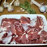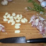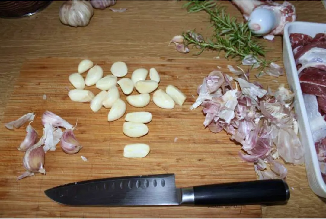 Przygotowanie mięsa i czosnku: Mięso pokrój w duże kawałki. Ząbki czosnku obierz, ale pozostaw w całości.