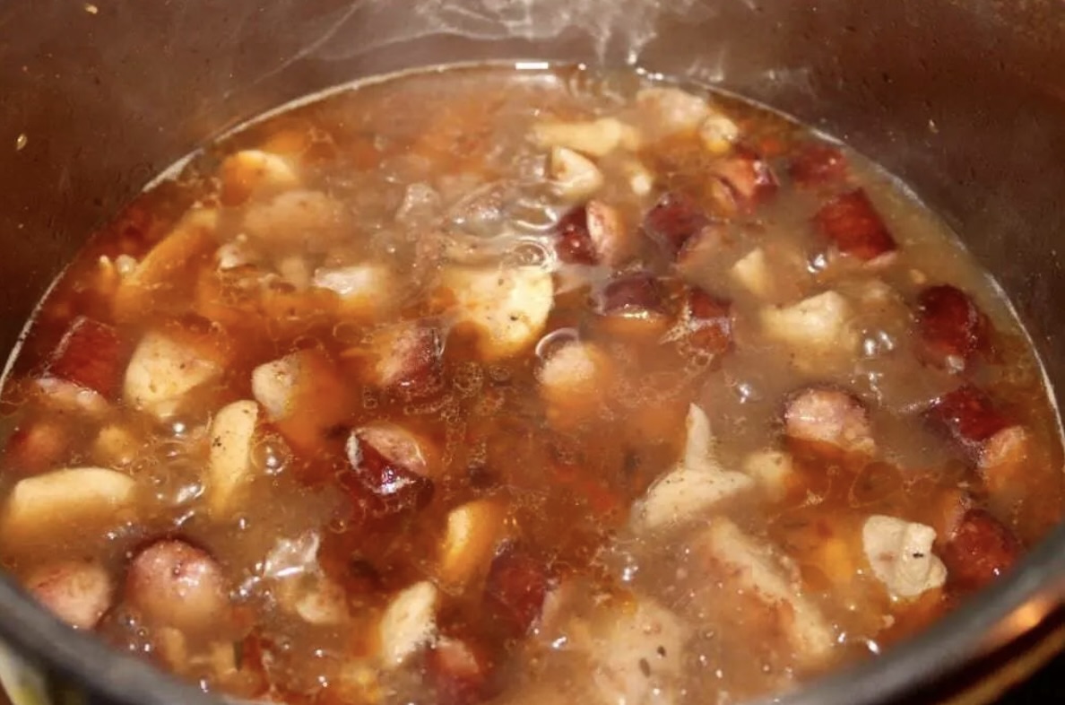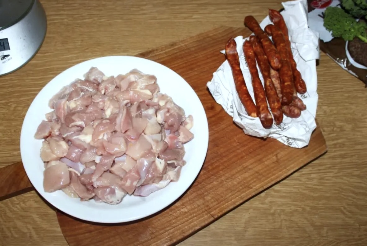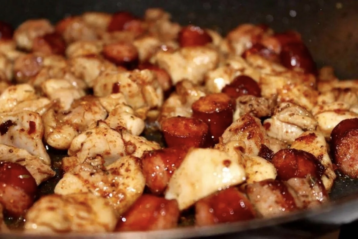 Smażenie kurczaka: Do podsmażonych kiełbasek dodaj kurczaka. Smaż całość jeszcze kilka minut, aż mięso się przyrumieni.