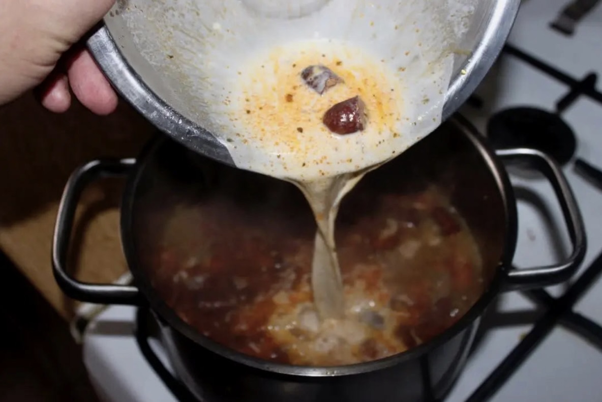Duszenie: Przełóż zawartość patelni do garnka. Dolej tyle wody, aby uzyskać pożądaną ilość sosu. Duś pod przykryciem na małym ogniu przez około 20 minut.