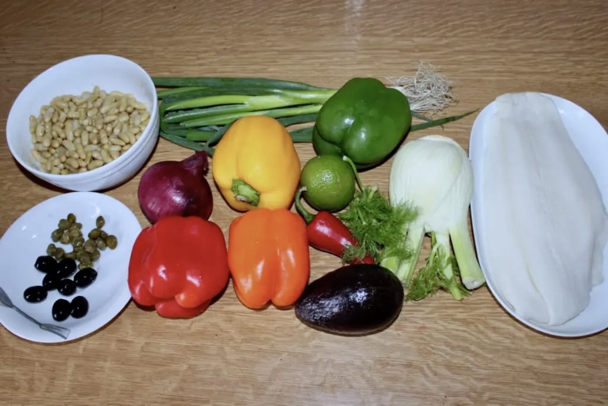 Na patelni (lub w woku) rozgrzej oliwę. Wrzuć pokrojone papryki, cebulę i fenkuł. Smaż krótko na mocnym ogniu (ok. 2 minuty), aby warzywa pozostały jędrne.