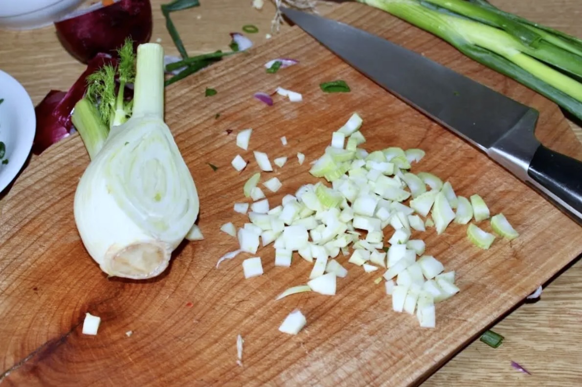 Wszystkie papryki oraz fenkuł pokrój w drobną kostkę. Cebulę pokrój w nieco większe kawałki, a dymkę posiekaj.