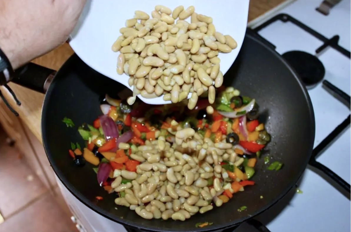 Na koniec dodaj odsączoną i przepłukaną fasolkę. Zmniejsz ogień – fasolka musi się tylko ogrzać.