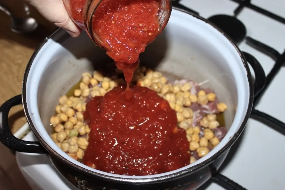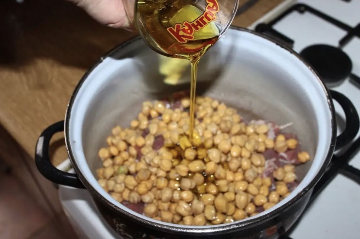 Przygotowanie początkowe: Do dużego garnka przełóż namoczoną przez noc i odcedzoną ciecierzycę. Dodaj mięso gulaszowe i wlej pół szklanki oliwy z oliwek.