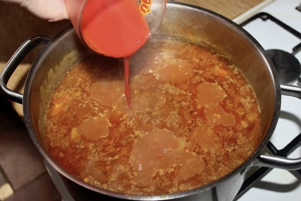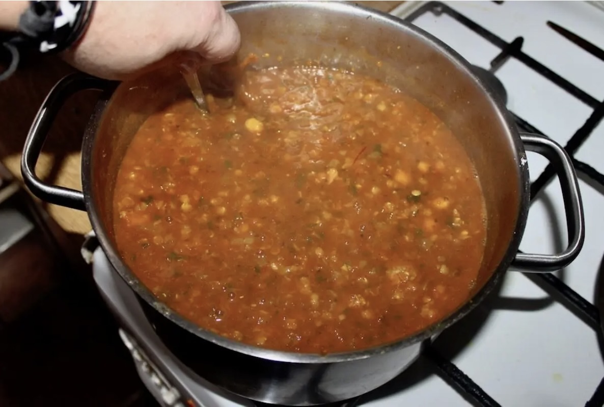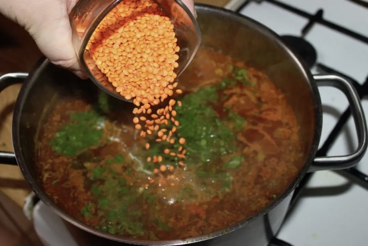 Dodawanie końcowych składników i gotowanie II: Po 45 minutach wlej do zupy rozpuszczony koncentrat pomidorowy. Wsyp posiekaną natkę pietruszki i świeżą kolendrę. Dodaj masło (najlepiej solone). Wsyp czerwoną soczewicę (ona zagęści zupę). Dla różnorodności możesz wrzucić również 2 garści zielonej lub brązowej soczewicy.